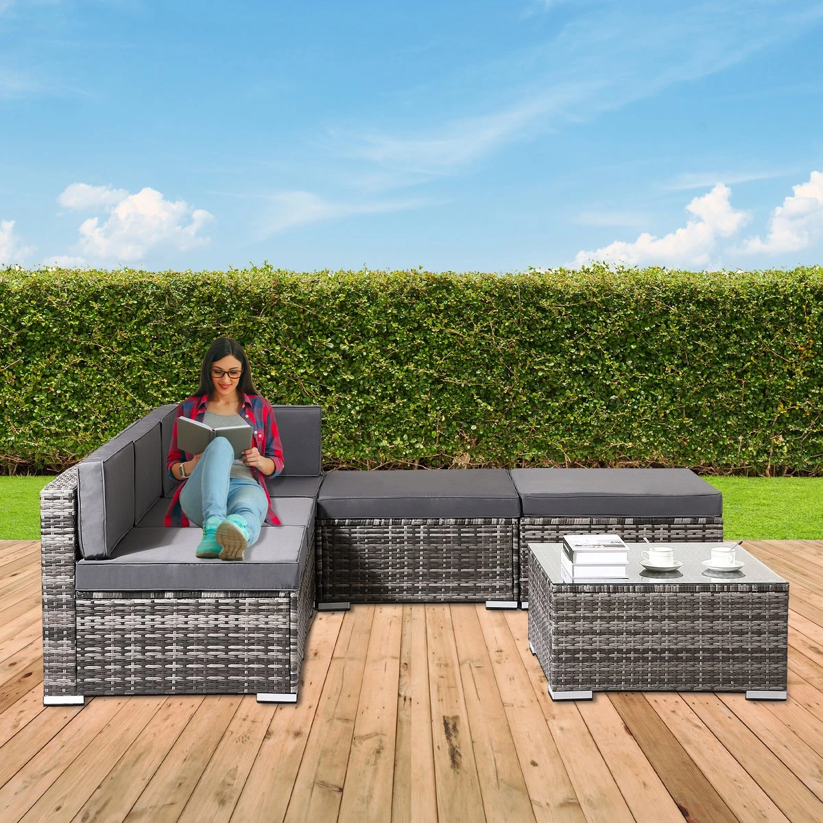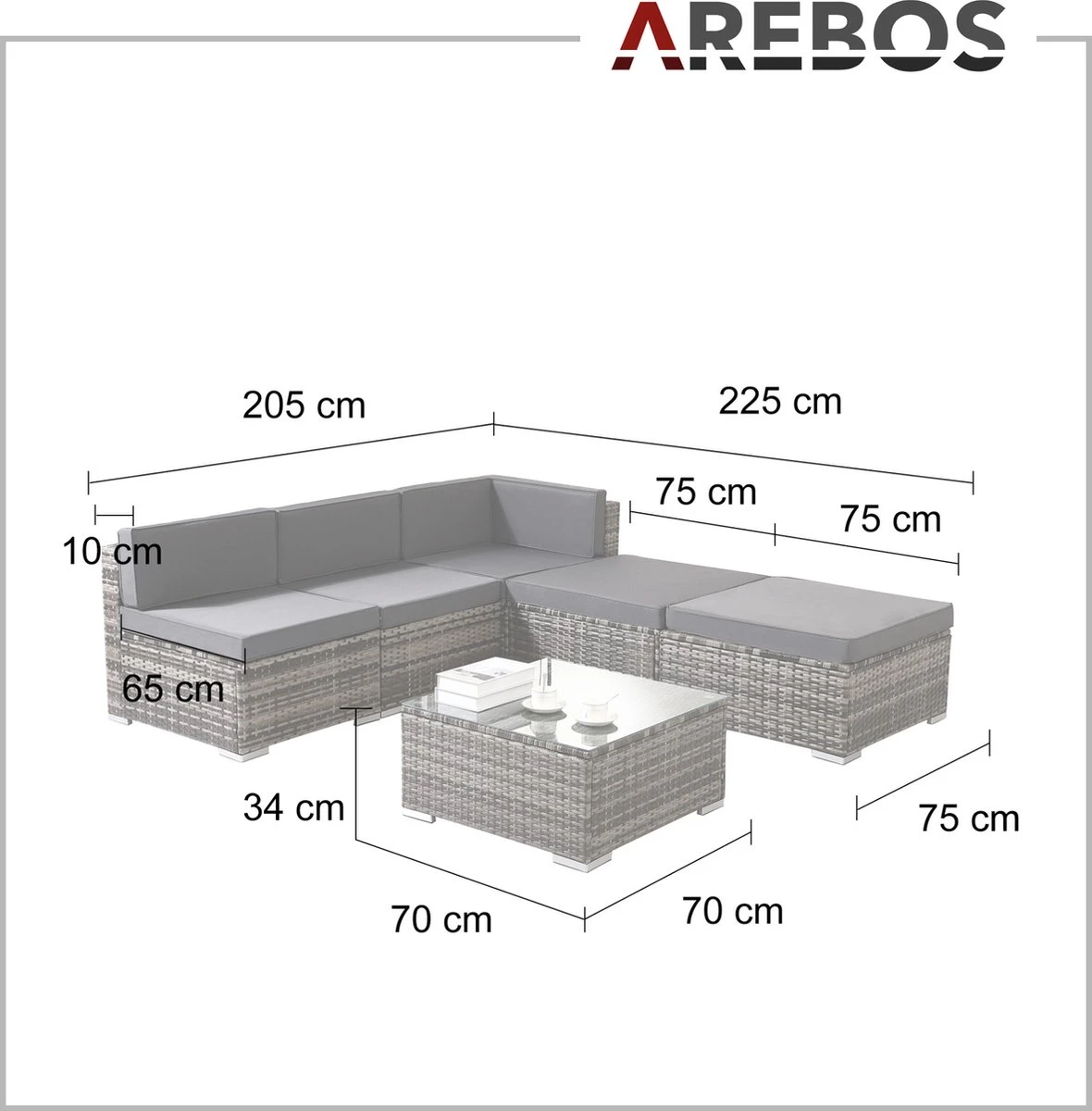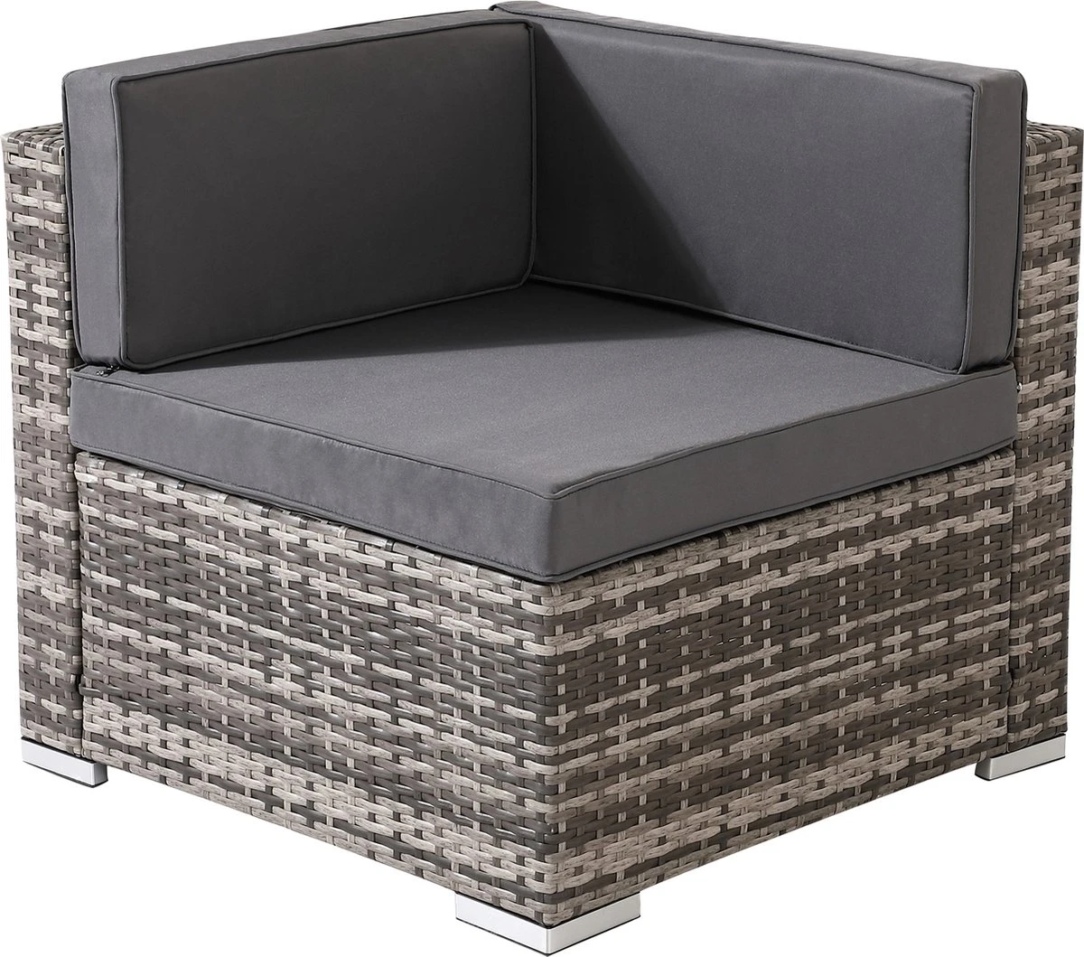 Cet ensemble de salon de jardin, composé d’un grand canapé (1 pièce d’angle, 2 pièces centrales), de deux tabourets et d’une table d’appoint, offre beaucoup d’espace. Les tabourets surdimensionnés peuvent être utilisés comme espace d’extension/relaxation et reliés aux côtés du canapé ou utilisés comme sièges séparés.