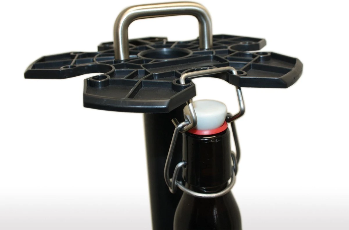 – porte-bouteille: avec système «click-in» pour placer jusqu’à 15 bouteilles. Ceci est garanti pour maintenir les bouteilles en place. Ce porte-bouteille en plastique a une poignée en acier pour une prise facile du support
