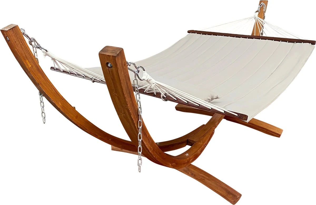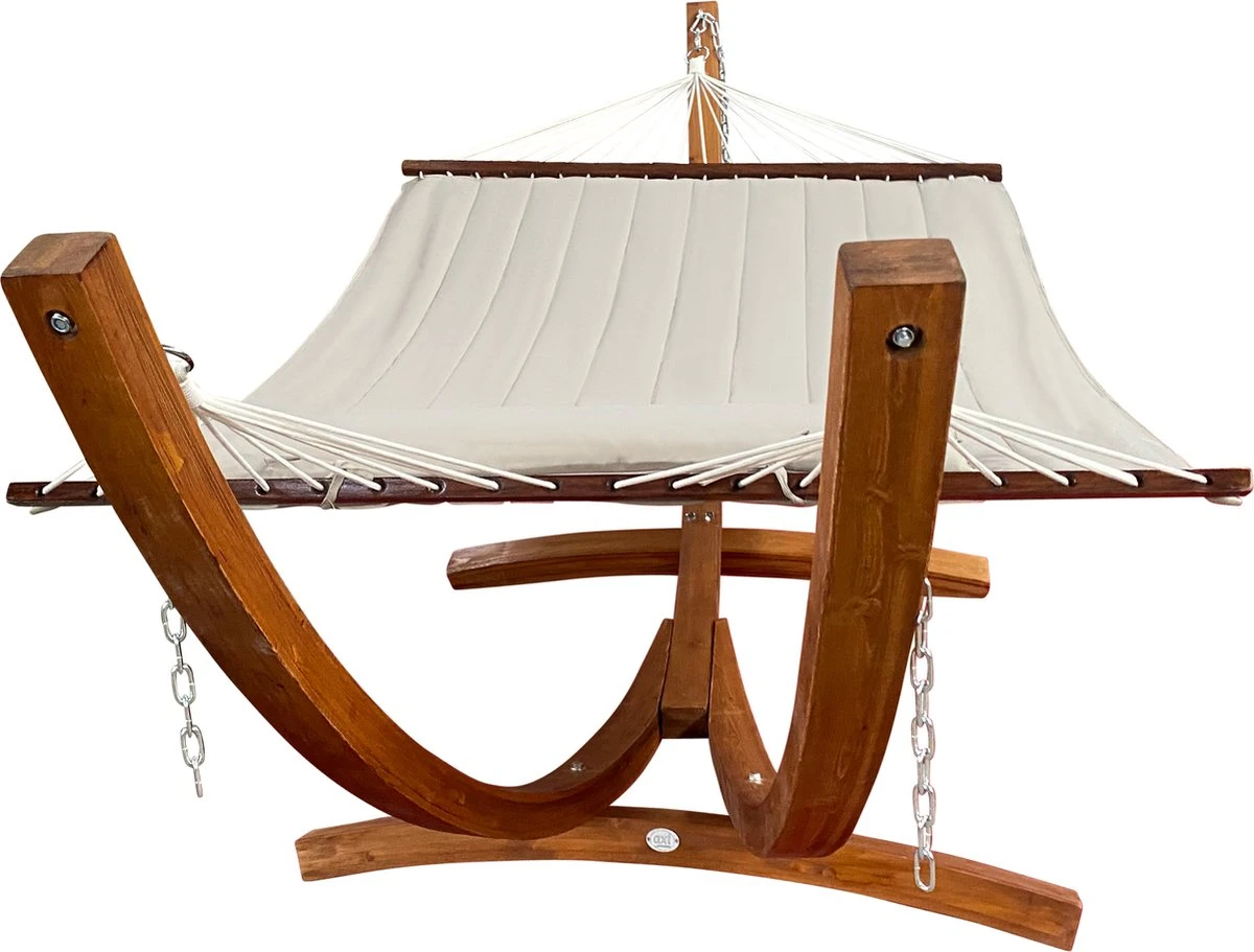 Vous pouvez utiliser le hamac aussi bien à l’intérieur qu’à l’extérieur. Le support est en bois de mélèze résistant aux intempéries et peut donc être laissé à l’extérieur sans problème. Le design classique du stand et du hamac fait de ce set de hamacs un accroche-regard absolu pour chaque jardin !