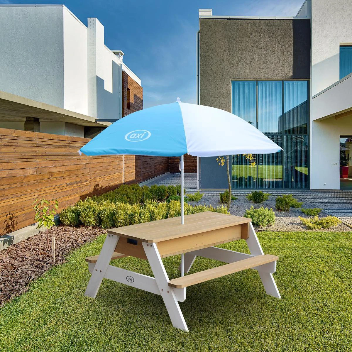 AXI Nick Table Sable Et Eau / Table Pique Nique Marron / Blanc – Table D’eau Avec Couvercle, Boîtes De Rangement & Parasol – Table De Jeu Enfant à Eau Pour Le Jardin
