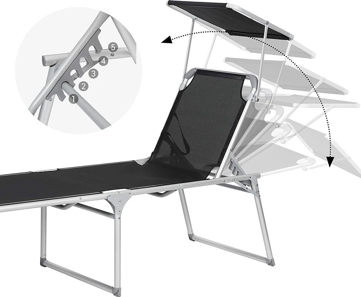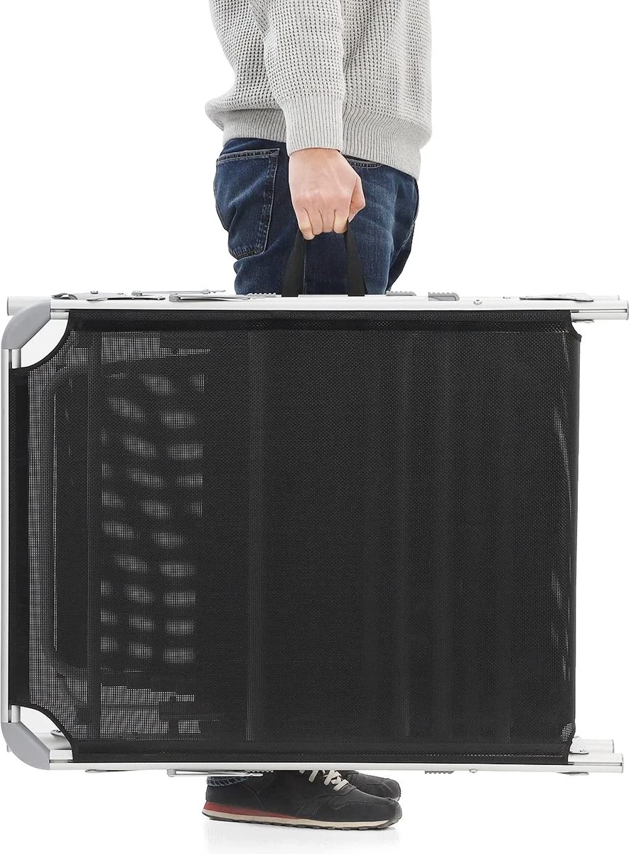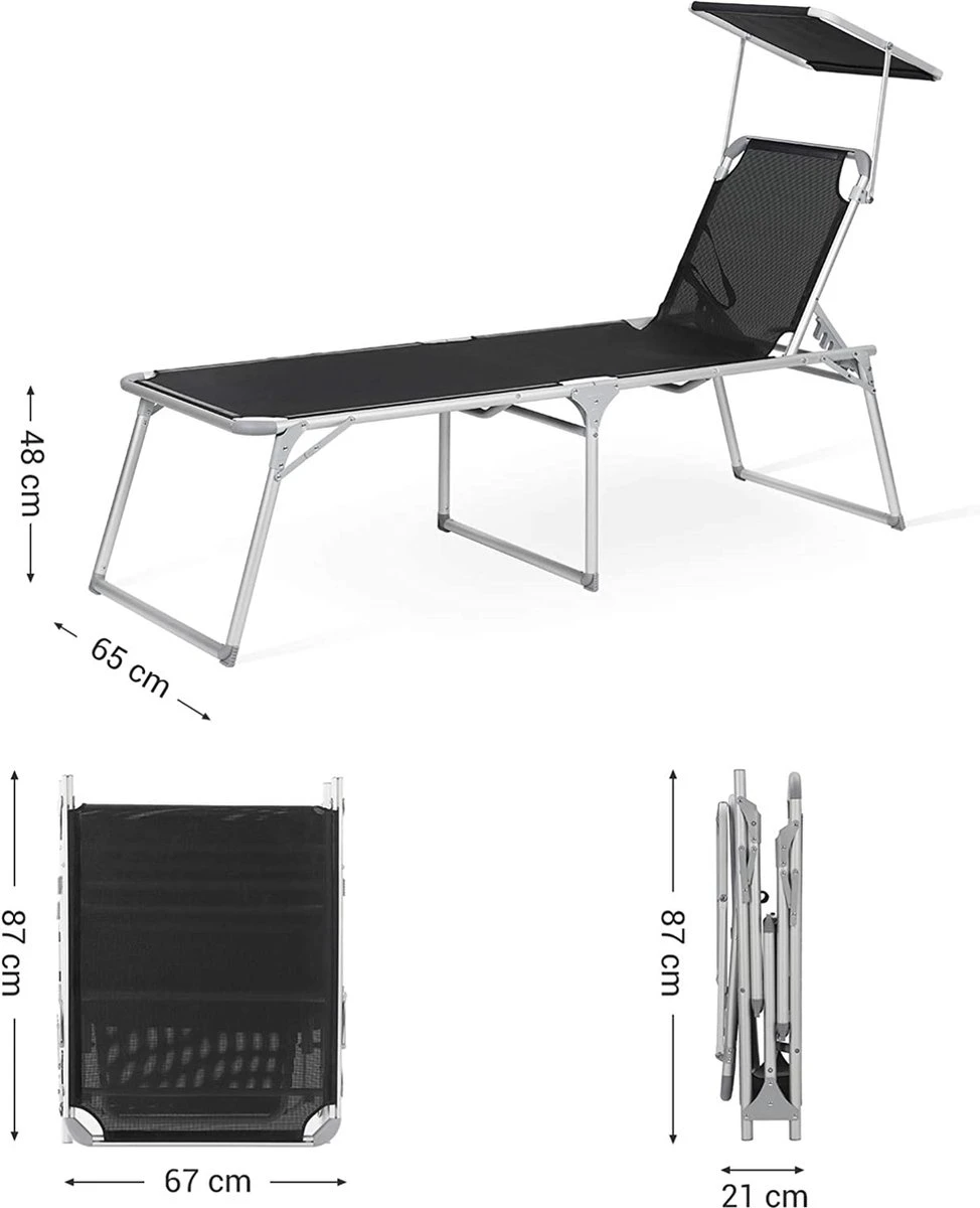 Détente à la maison : vous n’avez pas besoin de conduire loin jusqu’à un camping pour vous détendre. Procurez-vous cette chaise longue en tissu de fibres synthétiques respirant et laissez-vous un sentiment de vacances dans votre jardin. Ajustez le dossier (5 positions réglables) et trouvez votre position préférée. Asseyez-vous et écoutez le chant des oiseaux. Un vrai poids plume : vous devez d’abord ranger votre grand mobilier de jardin pour que vos enfants puissent jouer au foot dans le jardin ? Trop lourd, non ? Notre chaise longue en aluminium ne pèse que 4,9 kg. Il peut être facilement plié et emporté partout grâce à 2 poignées pratiques. A la piscine ou à la plage ? Exactement comme vous le souhaitez.Vous donne de l’ombre : vous aimez prendre un bain de soleil, mais vous voulez protéger vos yeux des rayons du soleil ? Le pare-soleil de cette chaise longue vous aide. A l’ombre, vous pouvez confortablement lire des livres. De plus, vous pouvez facilement régler le pare-soleil à la main, sans avoir à vous tenir à travers le siège.Pas seulement cet été : Fabriquée en aluminium robuste et antirouille et en tissu de fibres synthétiques résistant aux UV, cette chaise longue a une bonne capacité de charge (jusqu’à 150 kg). Les connecteurs renforcés augmentent également la stabilité. Geen de chaises longues bancales. Cette chaise vous accompagnera pendant de nombreuses années. 100% vacances : voulez-vous échapper à la vie professionnelle stressante? Cette chaise longue pratique vient à votre rescousse. Détendez-vous en sirotant un cocktail.