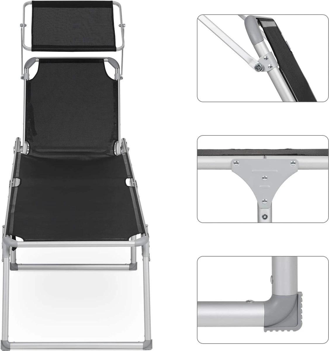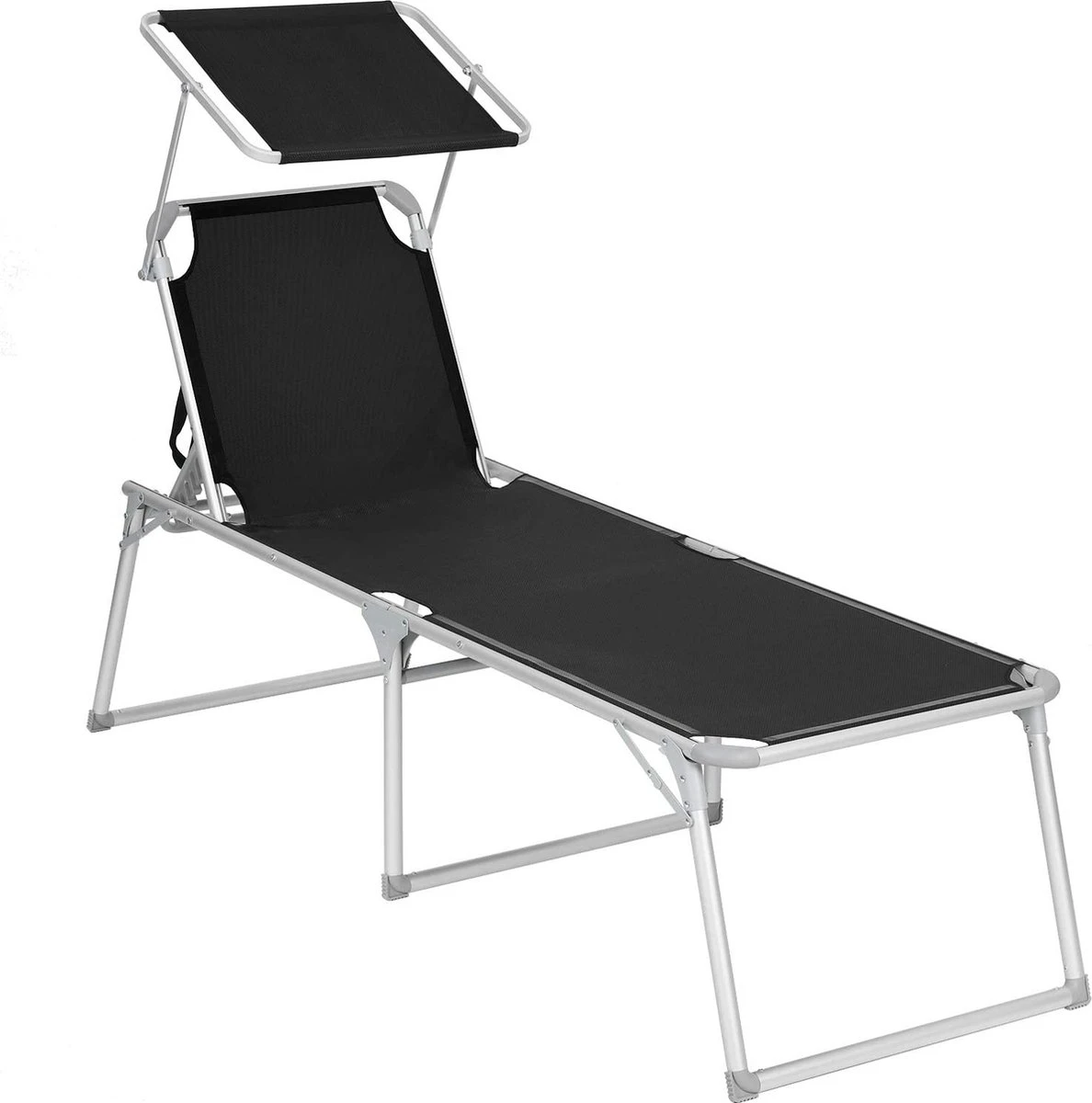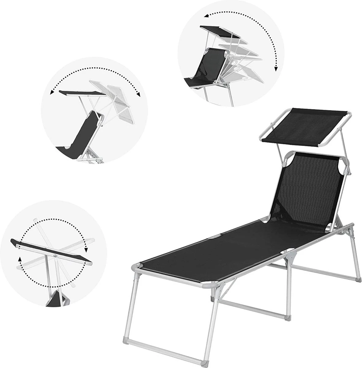 Détente à la maison : vous n’avez pas besoin de conduire loin jusqu’à un camping pour vous détendre. Procurez-vous cette chaise longue en tissu de fibres synthétiques respirant et laissez-vous un sentiment de vacances dans votre jardin. Ajustez le dossier (5 positions réglables) et trouvez votre position préférée. Asseyez-vous et écoutez le chant des oiseaux. Un vrai poids plume : vous devez d’abord ranger votre grand mobilier de jardin pour que vos enfants puissent jouer au foot dans le jardin ? Trop lourd, non ? Notre chaise longue en aluminium ne pèse que 4,9 kg. Il peut être facilement plié et emporté partout grâce à 2 poignées pratiques. A la piscine ou à la plage ? Exactement comme vous le souhaitez.Vous donne de l’ombre : vous aimez prendre un bain de soleil, mais vous voulez protéger vos yeux des rayons du soleil ? Le pare-soleil de cette chaise longue vous aide. A l’ombre, vous pouvez confortablement lire des livres. De plus, vous pouvez facilement régler le pare-soleil à la main, sans avoir à vous tenir à travers le siège.Pas seulement cet été : Fabriquée en aluminium robuste et antirouille et en tissu de fibres synthétiques résistant aux UV, cette chaise longue a une bonne capacité de charge (jusqu’à 150 kg). Les connecteurs renforcés augmentent également la stabilité. Geen de chaises longues bancales. Cette chaise vous accompagnera pendant de nombreuses années. 100% vacances : voulez-vous échapper à la vie professionnelle stressante? Cette chaise longue pratique vient à votre rescousse. Détendez-vous en sirotant un cocktail.