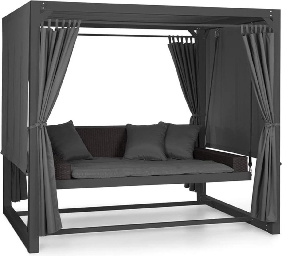 Romance Pure . Avec le Blumfeldt Eremitage, vous pouvez placer un petit château de plaisance dans votre jardin qui dissimule une balançoire luxueuse d’Hollywood aux regards indiscrets dans un secret vertueux. La construction stable en acier massif avec un revêtement en poudre forme le corps du luxueux grand canapé à bascule Hollywood. Le cadre est recouvert d’un textile hydrofuge et résistant aux intempéries, qui non seulement confère au Blumfeldt Eremitage son élégance optique, mais offre également une protection. Pendant que vous dormez doucement, enfoncé dans les confortables coussins de 5 cm d’épaisseur, le toit ouvrant empêche les rayons brutaux du soleil, une brise fraîche du soir ou une légère pluie d’été d’interrompre votre état de rêve. Les accoudoirs et les dossiers en polyrattan ainsi que les trois grands coussins moelleux offrent une sécurité et un confort supplémentaires.La balançoire Blumfeldt attirera sans aucun doute les yeux de tous grâce à son design extraordinaire. Cependant, les Rideaux à l’avant et à l’arrière bloquent toute vue et garantissent votre intimité Un château dans le vert. Ce qui n’était autrefois réservé qu’à un groupe restreint, vous pouvez désormais vous placer entre les parterres de roses et la hedera. La balançoire de luxe Hollywood Blumfeldt évoque une serrure de rêve dans un sentiment de sécurité et de balancement doux. Couleurs disponibles: gris foncé / noir, blanc / taupe (article 10031411)
