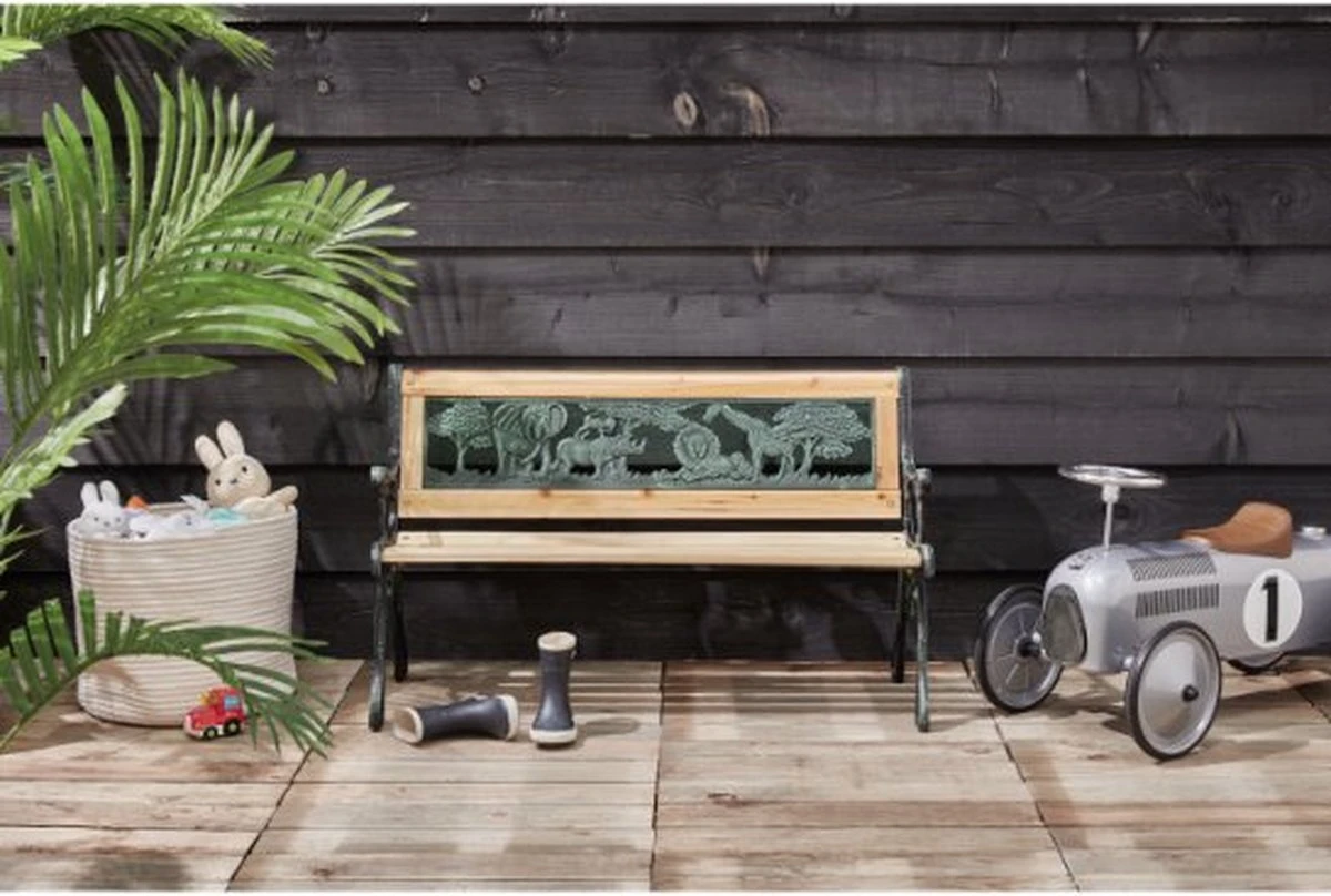 Ce banc de jardin décoratif en bois est idéal pour les enfants de par ses dimensions adaptées. Le banc a un look vintage en raison de la finition du cadre en fer de couleur bronze. Les lattes et le dossier en bois vous permettent de vous asseoir confortablement pendant longtemps. Ce banc de jardin est très adapté aux enfants en raison de ses dimensions. Grâce aux animaux et aux plantes sur le dossier, vos enfants s’amuseront pendant qu’ils sont assis sur le canapé. Attention : vérifiez les dimensions de ce banc avant de vous décider à l’acheter, car il s’agit d’un banc pour enfant.