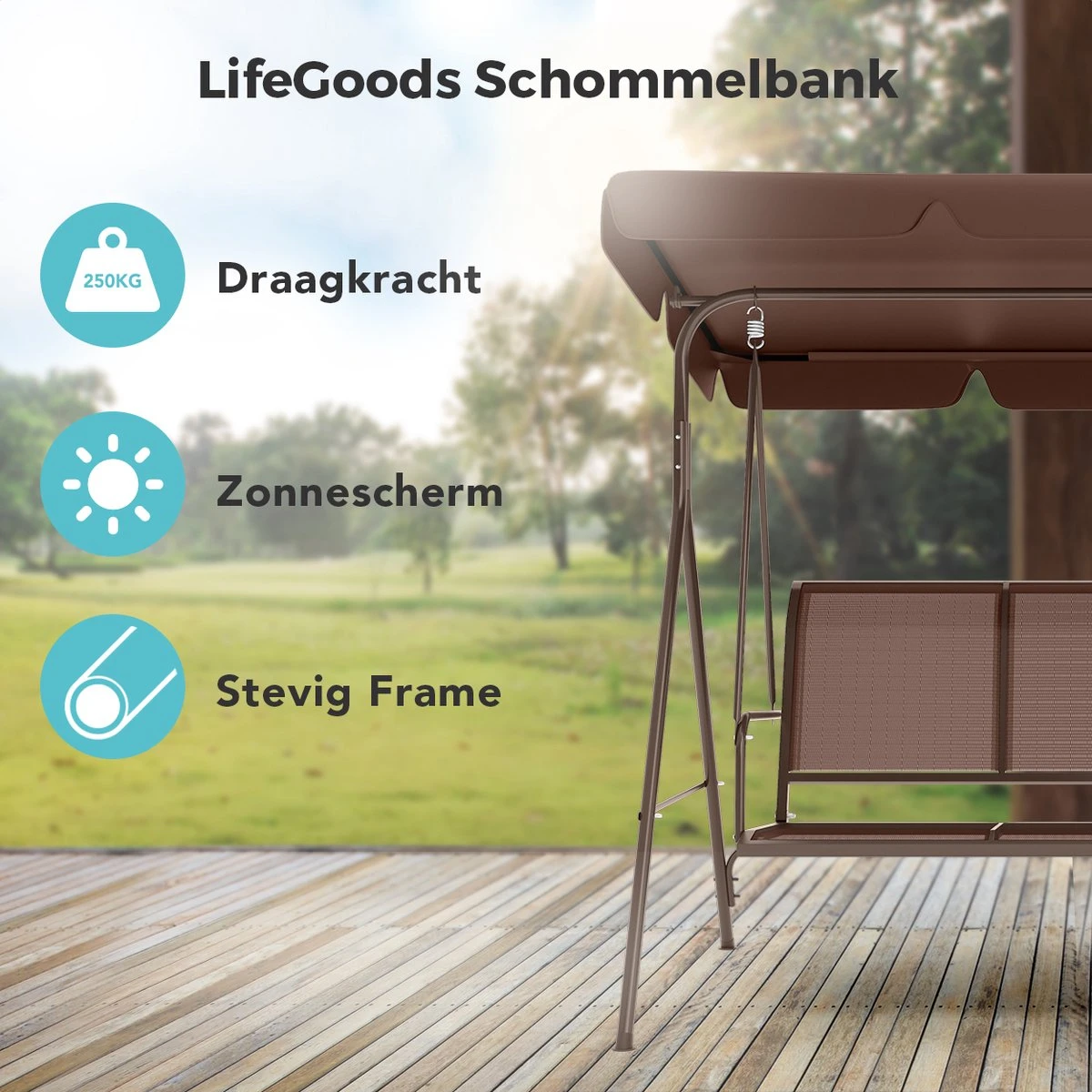 La balançoire LifeGoods est idéale pour 3 personnes. Le banc a une capacité de charge allant jusqu’à 250 kg. Le grand auvent couvre une superficie de 1,90m2. Plus qu’assez pour offrir de l’ombre à tout le monde ! Avec la large surface, vous pouvez bien sûr aussi vous étirer.