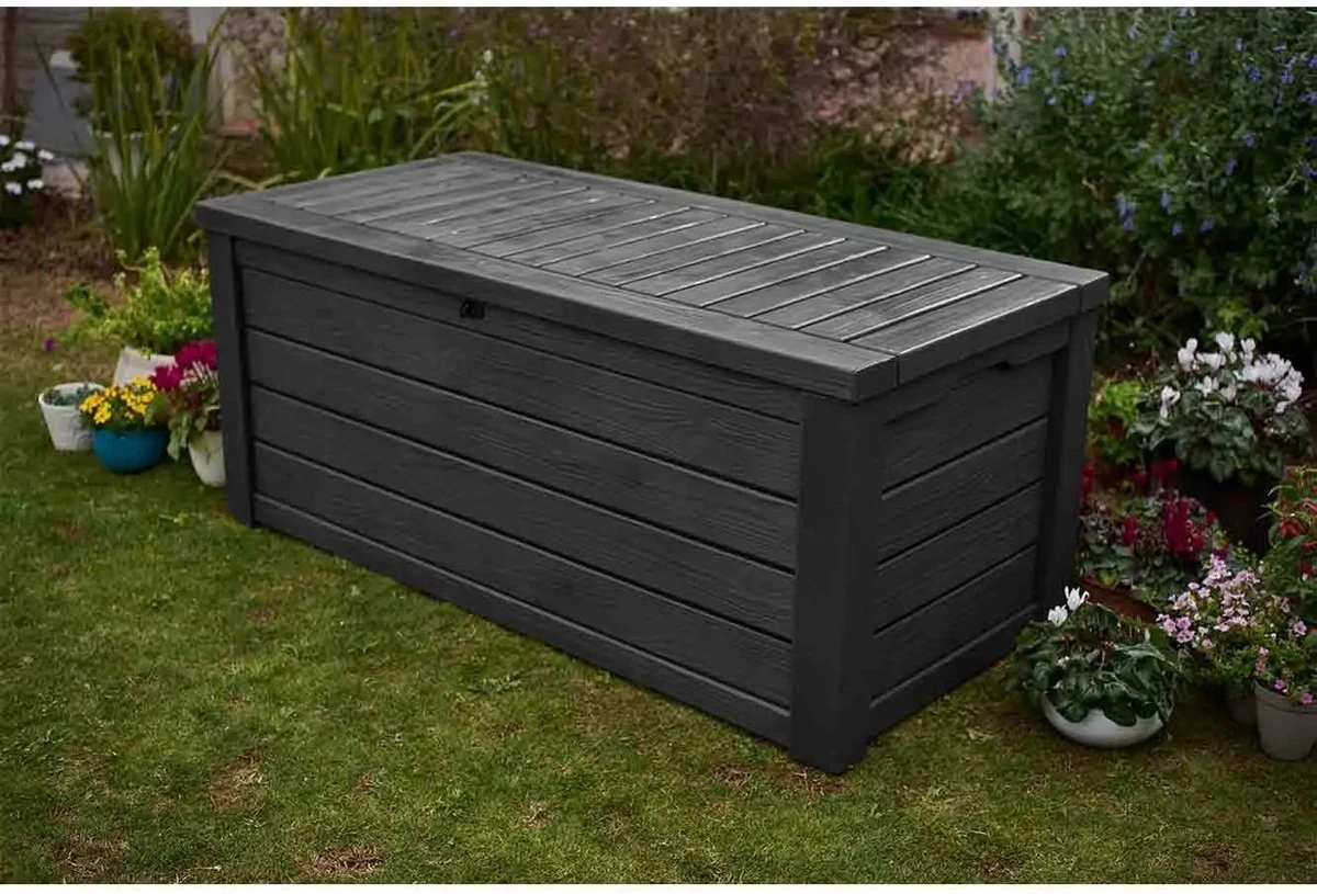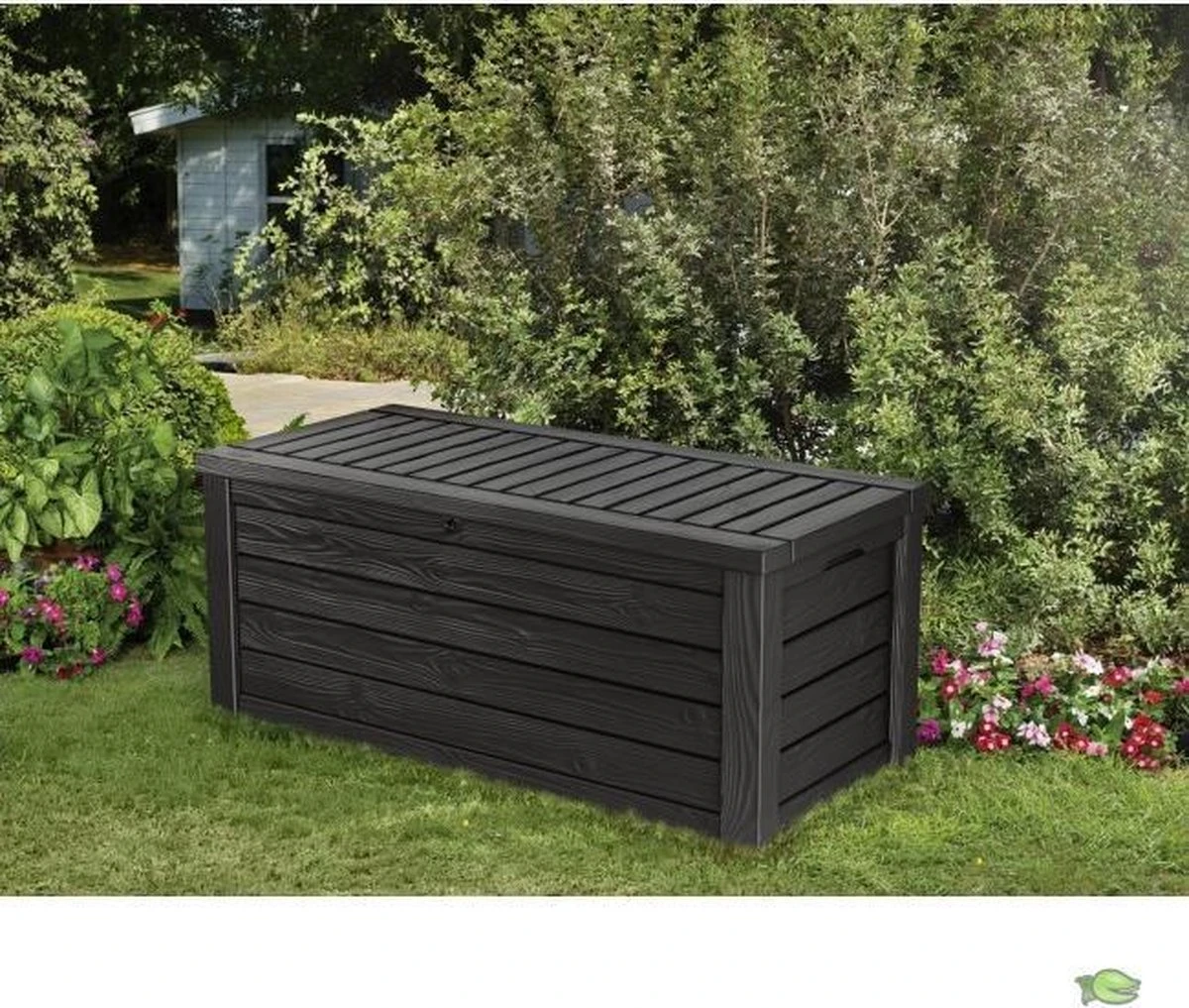 Très belle boîte à oreiller d’aspect bois. La boîte de rangement a une capacité de pas moins de 570 litres et est équipée de ressorts à gaz pratiques dans le couvercle.La couleur anthracite avec aspect bois donne à la boîte un bel aspect luxueux. Cette boîte à coussin est également très robuste, de sorte qu’elle peut être utilisée par deux personnes comme siège. Les dimensions extérieures de la boîte sont: 155×72,4×64,4cm.