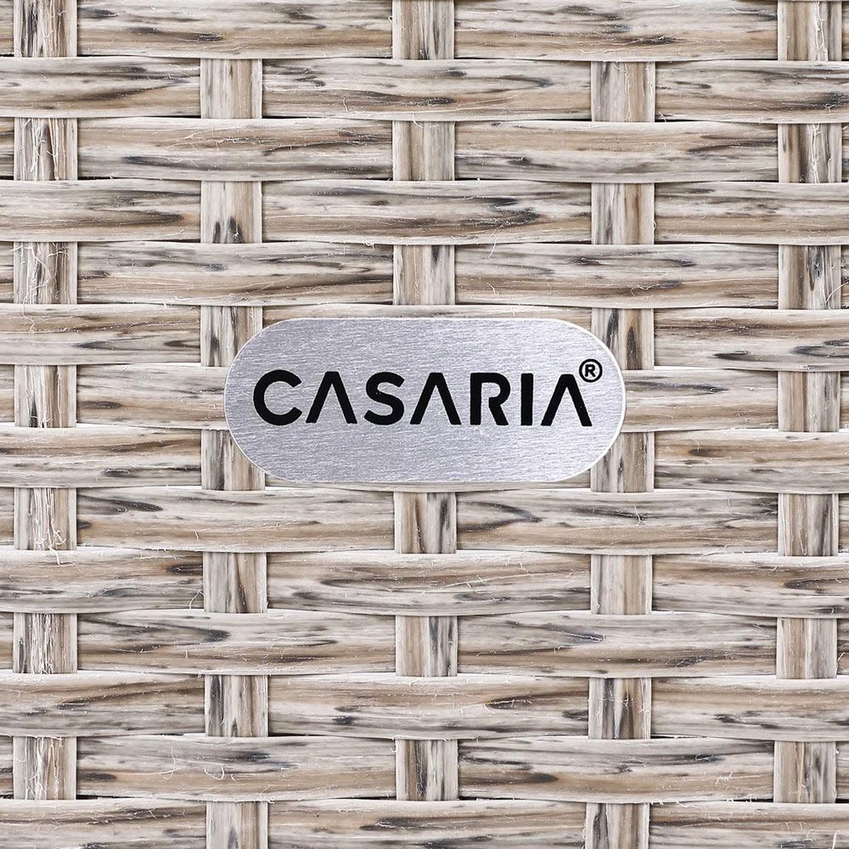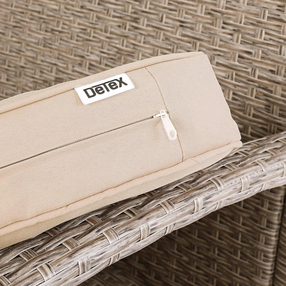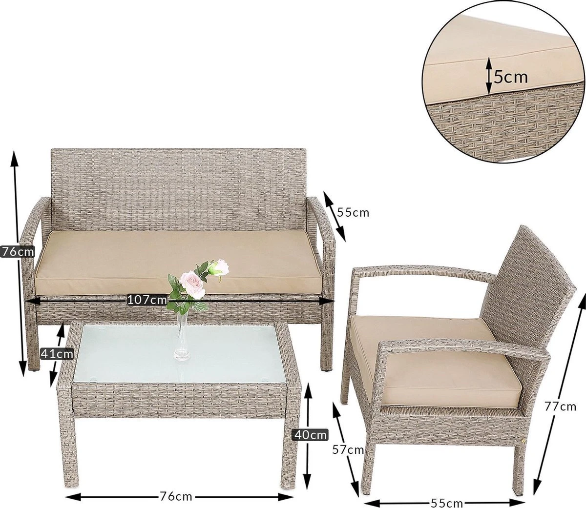 L’ensemble de salon en poly rotin de 7 pièces se compose d’une table, de deux chaises et d’un canapé – chacun avec des coussins amovibles (5 cm d’épaisseur).
