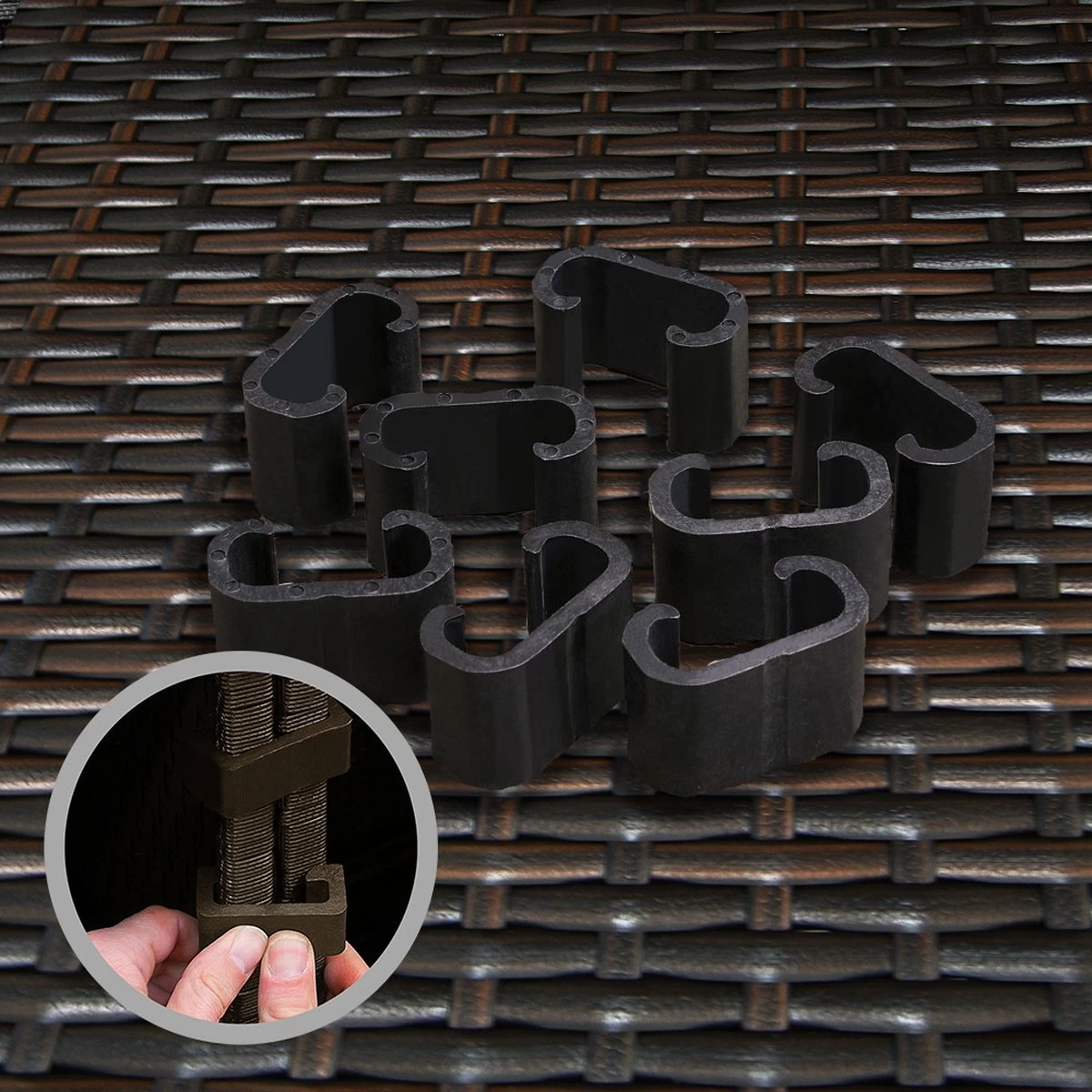 Chaque élément est équipé de pieds robustes, qui assurent également uneposition ferme sur votre terrasse. Pour protéger le sol des rayures, les pieds sont équipés deprotecteurs en plastique † Les éléments individuels de l’ensemble peuvent être6 clips de connexion être connectés les uns aux autres.