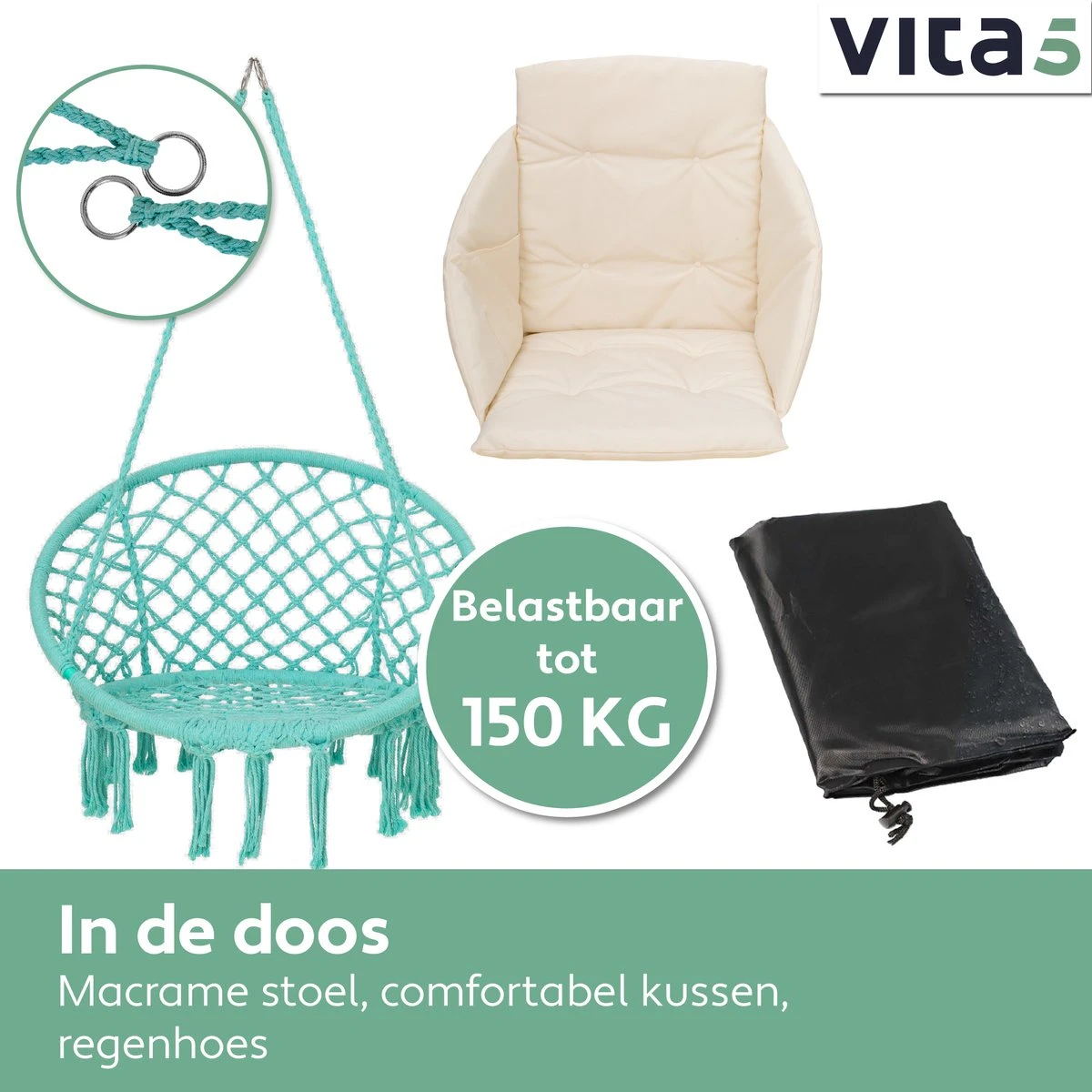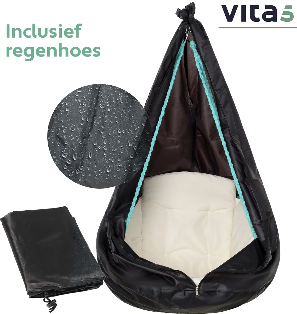 Peut être facilement rangé sans kussen et emporté n’importe où Assise Ø61cm Anneau extérieur Ø82cm Dimensions construites (L x H): 82 x 138 cm Dimensions une fois plié (L x H): 82 x 5 cm Matière: 60% coton , 40% polyester L’ensemble contient: chaise suspendue d’extérieur, kussen, porte-gobelet, housse, manuel néerlandais.