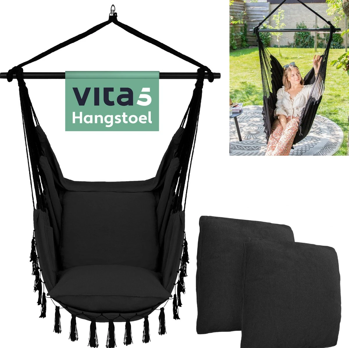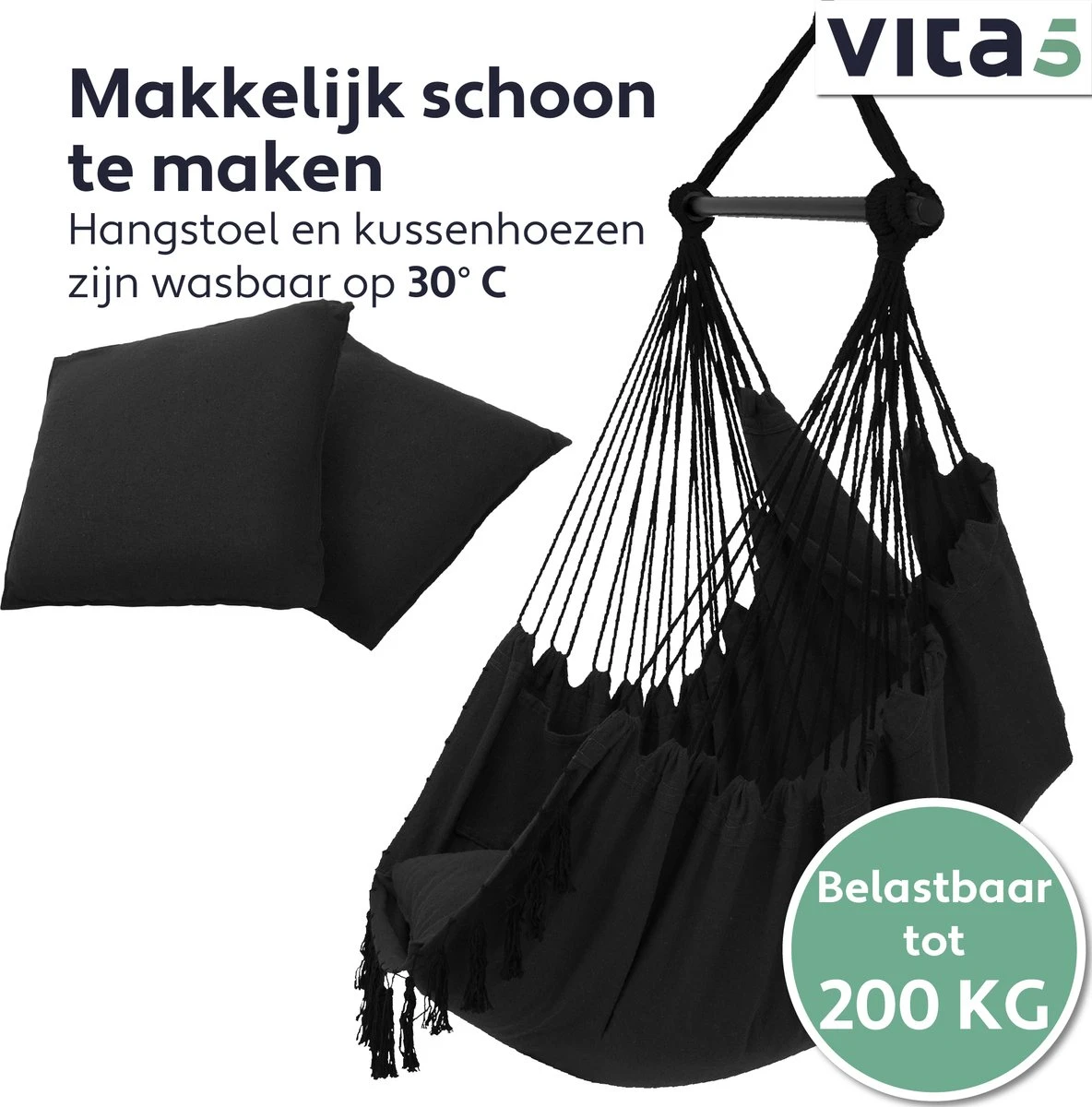 Contrairement à de nombreux autres fauteuils suspendus, le fauteuil suspendu Vita5 est pliable et le cadre en acier enduit de poudre est facile à monter et à démonter. Vous pouvez facilement plier le panier robuste dans un emballage plat facile à ranger. La housse fournie contribue à la résistance aux intempéries et prolonge la durée de vie. La housse protège votre nouvelle chaise préférée contre le vent, la pluie, la rouille et la saleté.