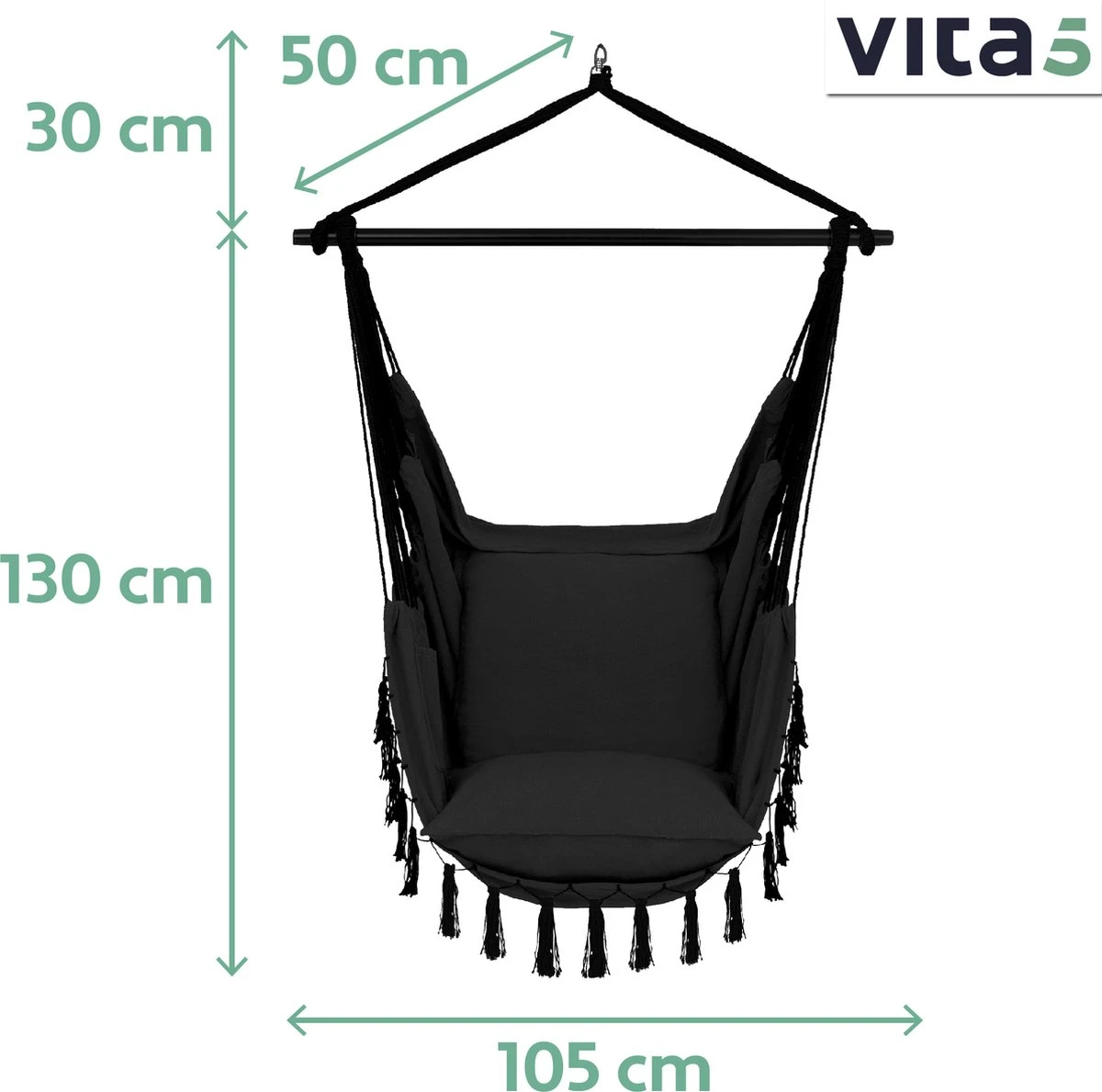 Amusez-vous à vous bercer dans votre chaise suspendue Vita5 avec une capacité de charge de 150 kg ! Le panier est composé d’anneaux en acier polyrotin avec un filet de fils de coton entre eux. Cette construction offre résistance et stabilité. Le montant (cadre) est facile à construire. Les tubes en acier de 5 cm d’épaisseur assurent la stabilité du cadre.