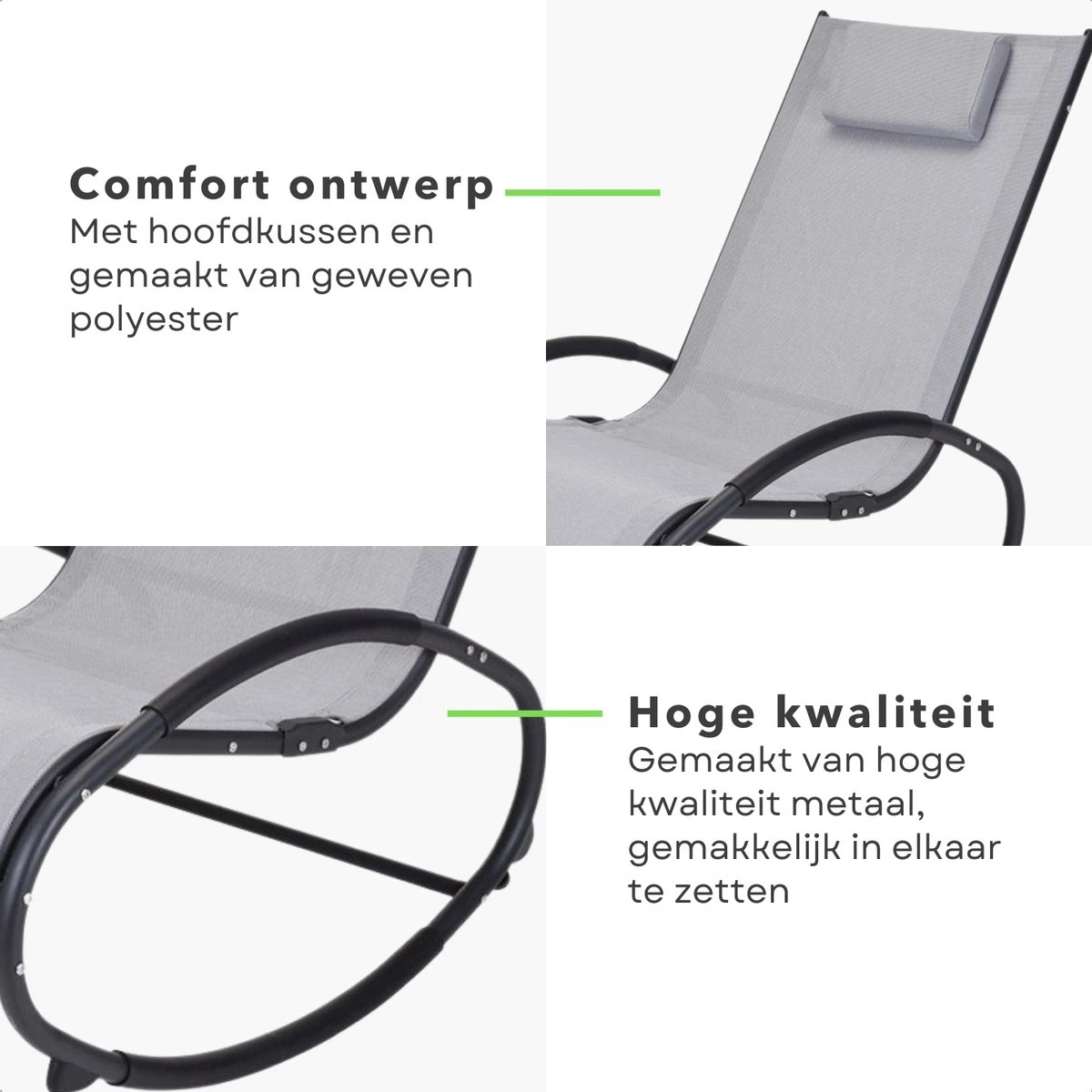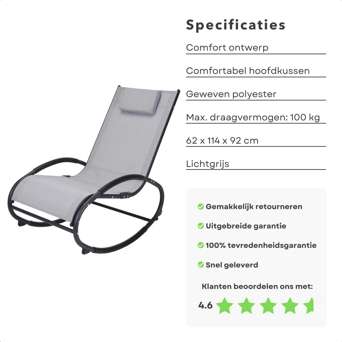 La chaise berçante Cheqo est un merveilleux ajout à n’importe quel jardin. La chaise a une couleur gris clair et est fabriquée en polyester tissé 2×1, ce qui la rend durable et confortable. L’oreiller vous permet de vous détendre tout en profitant du plein air. Avec une capacité de charge maximale de 100 kg, la chaise peut être utilisée par n’importe qui.