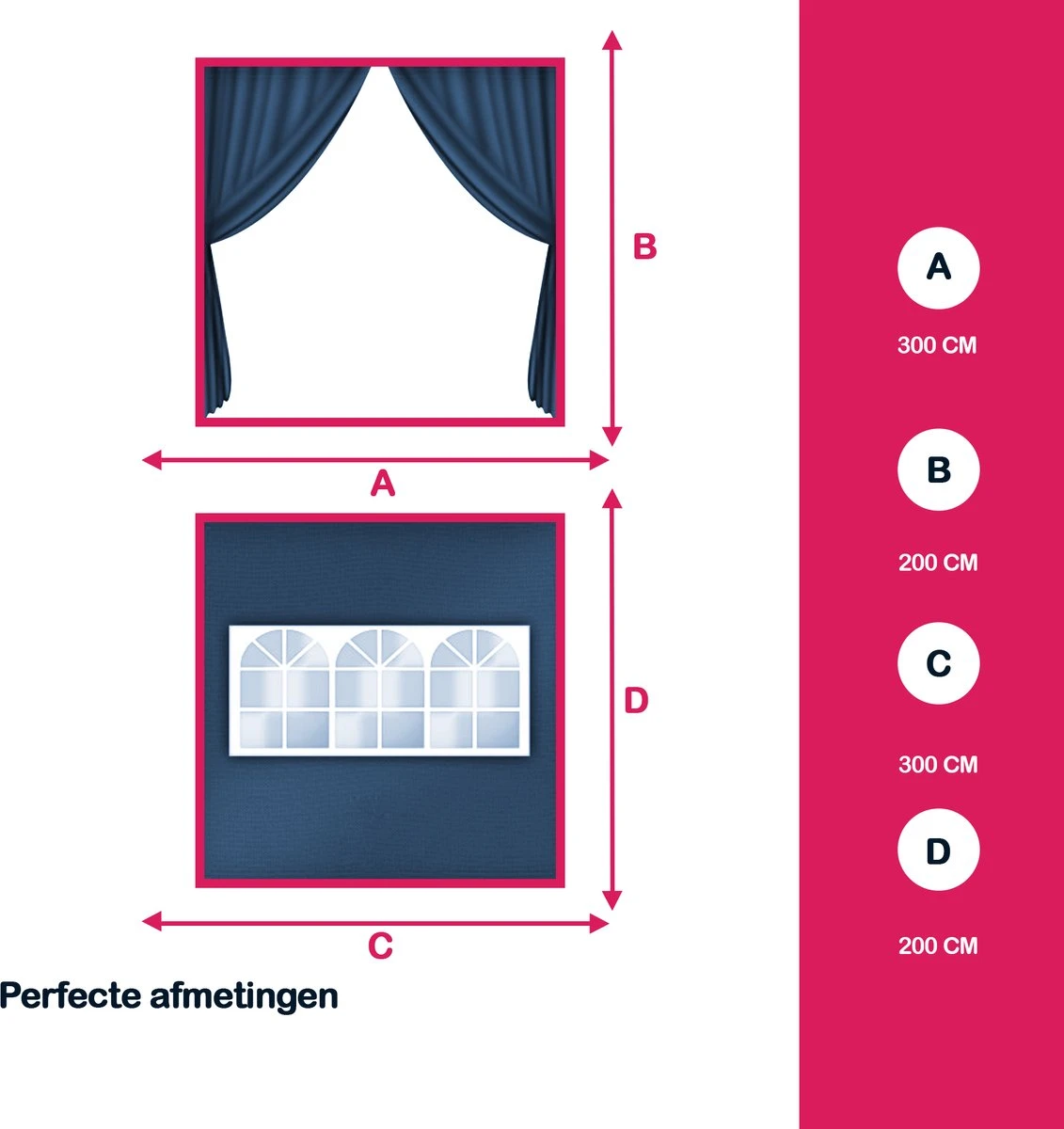 Les parois latérales conviennent à tous les pavillons d’une longueur de côté de 3 ou 6 mètres . Par exemple, deux de ces ensembles enferment complètement un pavillon de 3x3m.