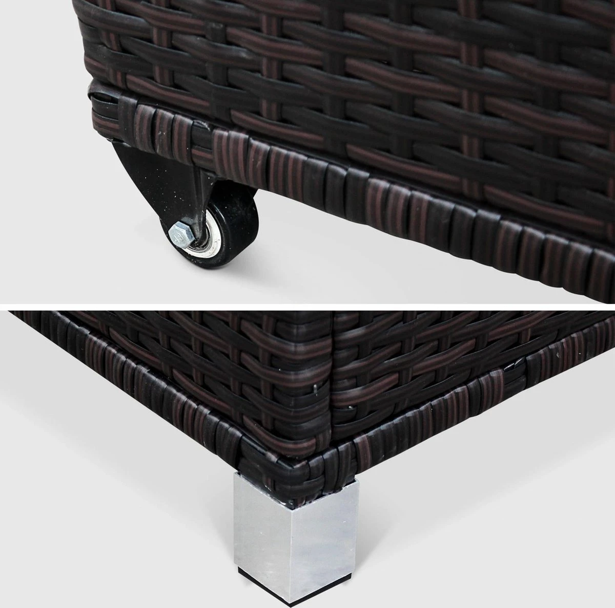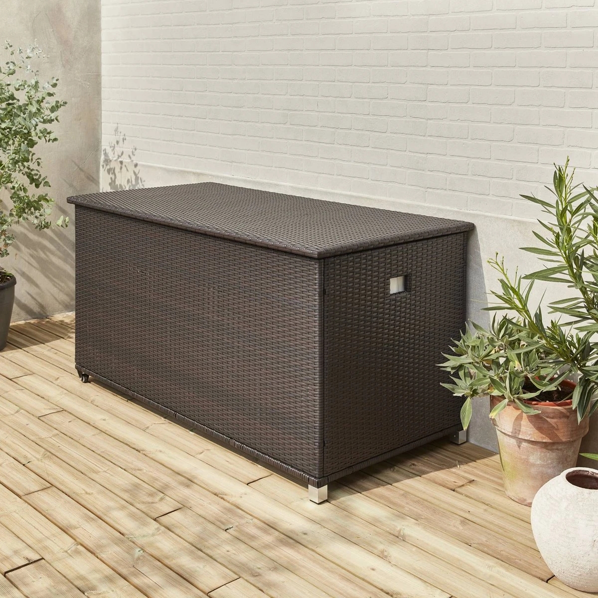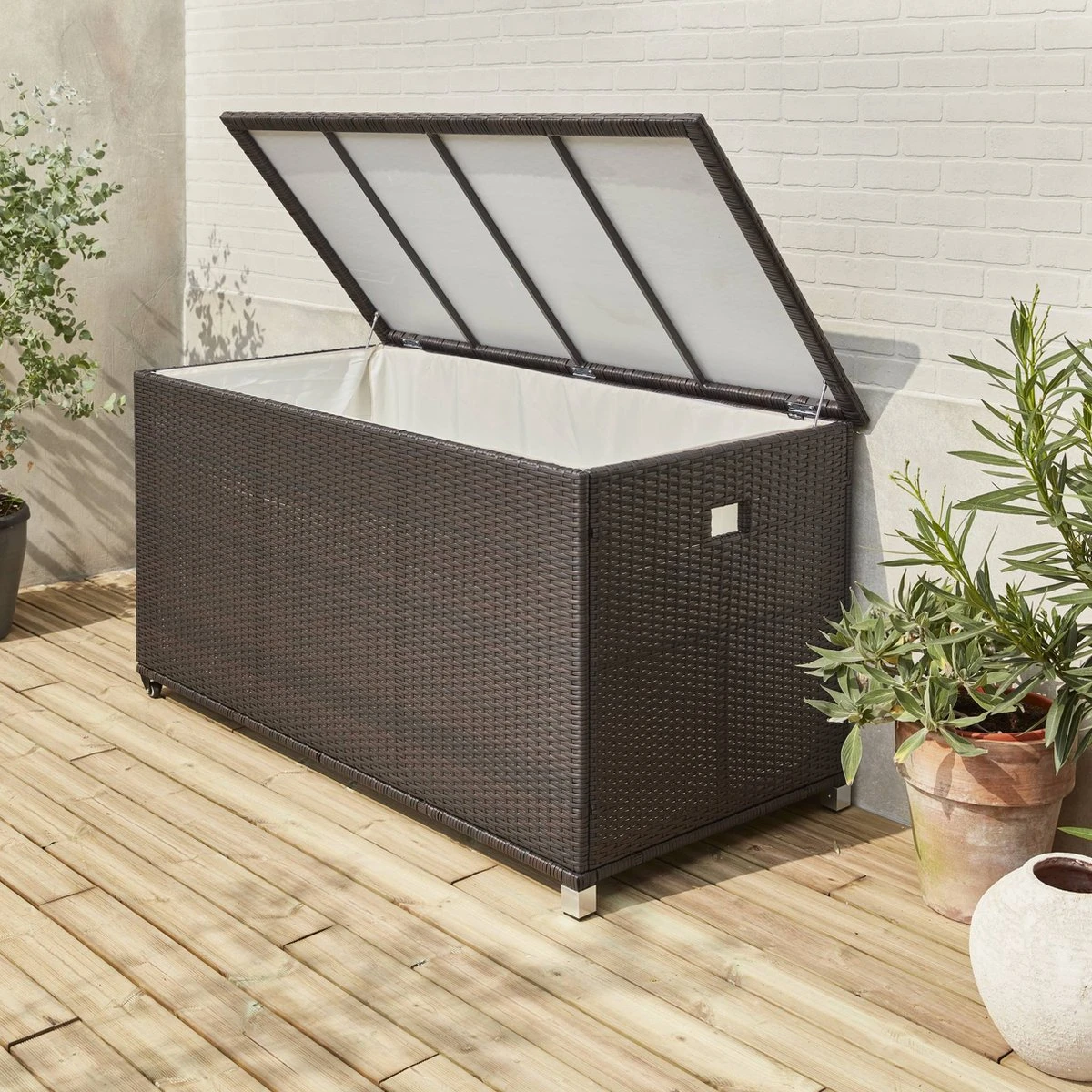 Ce coffre de jardin est robuste. La résine tressée est conçue pour une utilisation extérieure et l’aluminium ne rouille pas, par nature.