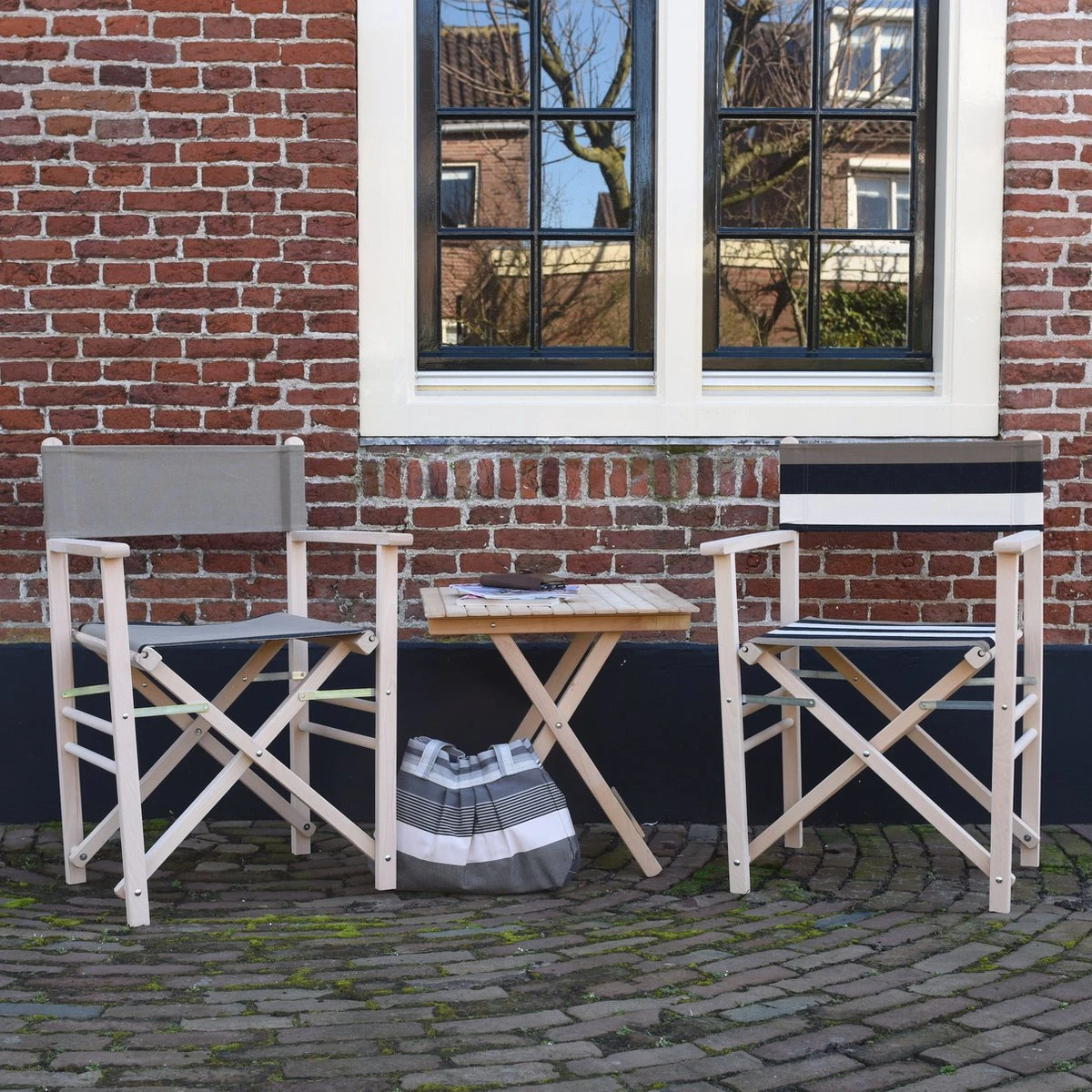 Les chaises et la table du directeur sont en bois de hêtre non traité. Les chaises ont des pieds latéraux renforcés et croisés, un dossier droit et peuvent supporter jusqu’à 120 kg. Le plateau de table se fixe facilement aux pieds de la table par un crochet. Le tissu rayé est un tissu d’ outdoor Sunbrella et donc résistant aux intempéries, est amovible et lavable.