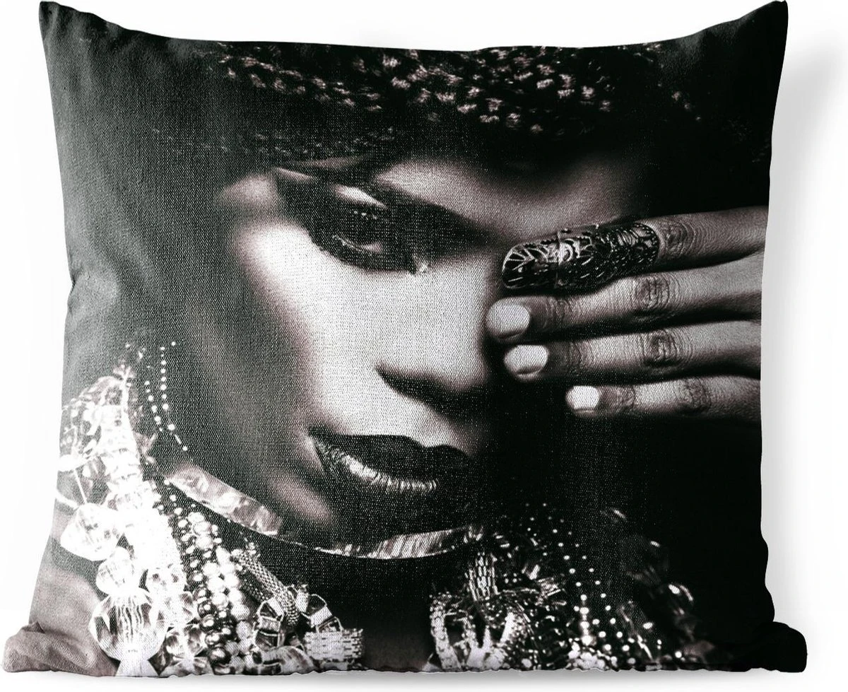 Une image en noir et blanc d’une femme portant beaucoup de bijoux.
