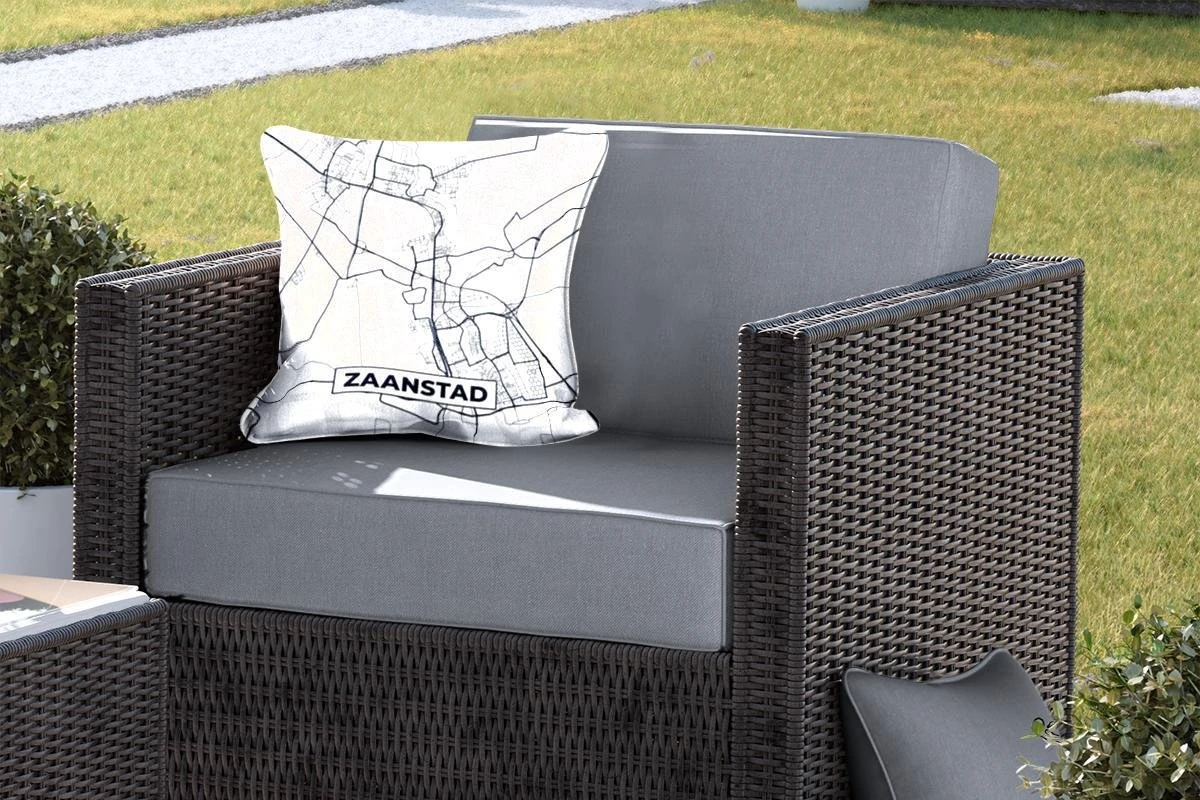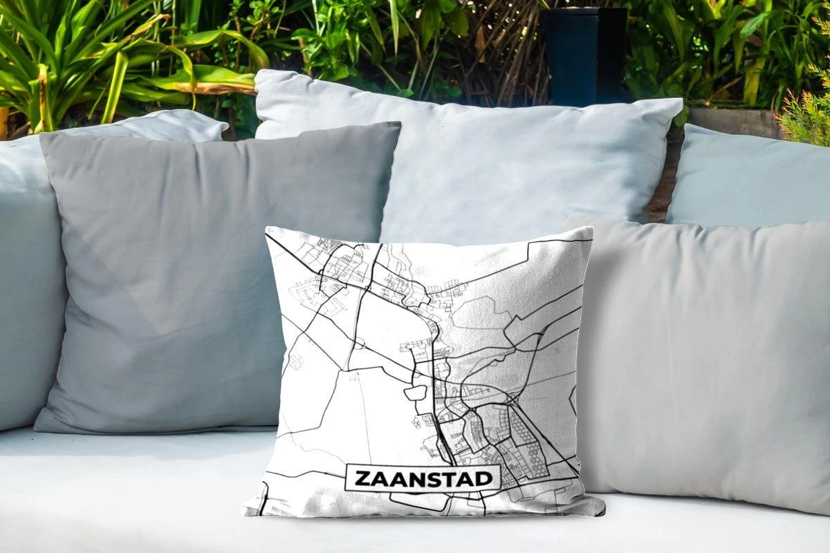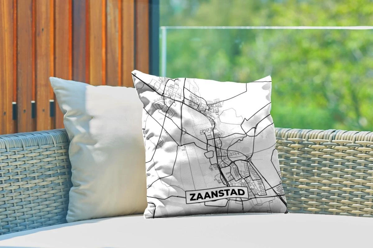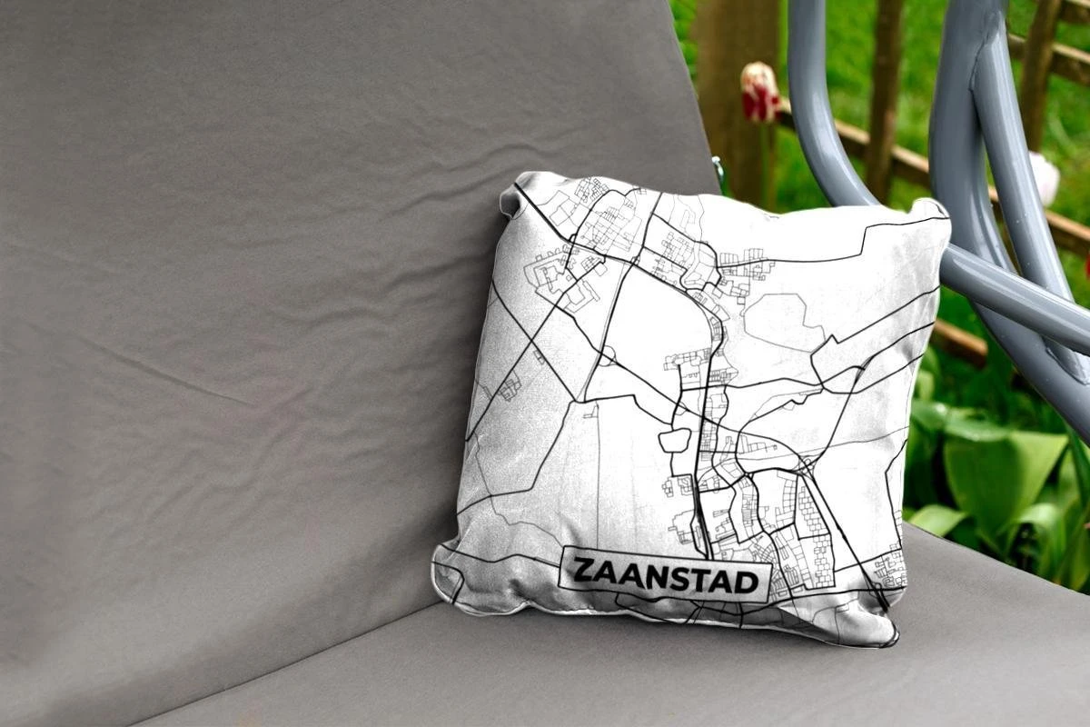 Version minimaliste et noir et blanc de la carte de Zaanstad. Le naam de la ville néerlandaise est écrit en grosses lettres noires au bas de la carte.