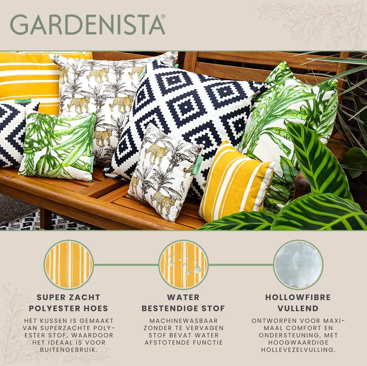 La housse de coussin est en toile de coton traitée, résistante à l’eau et lavable en machine. De plus, l’ kussen est rempli de fibres creuses de haute qualité.