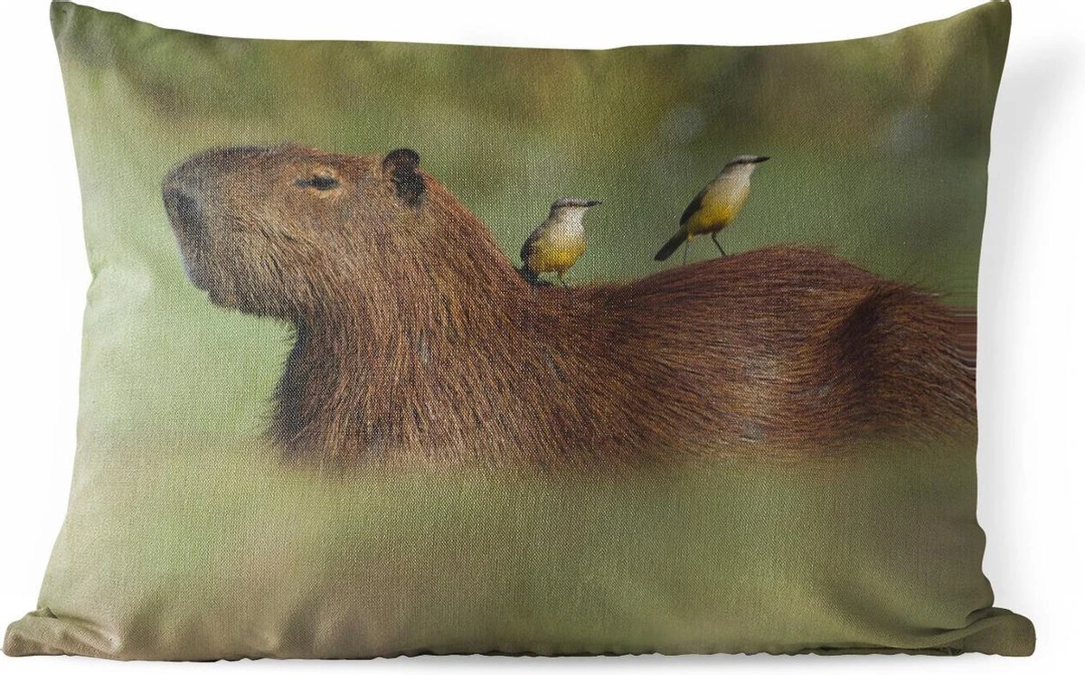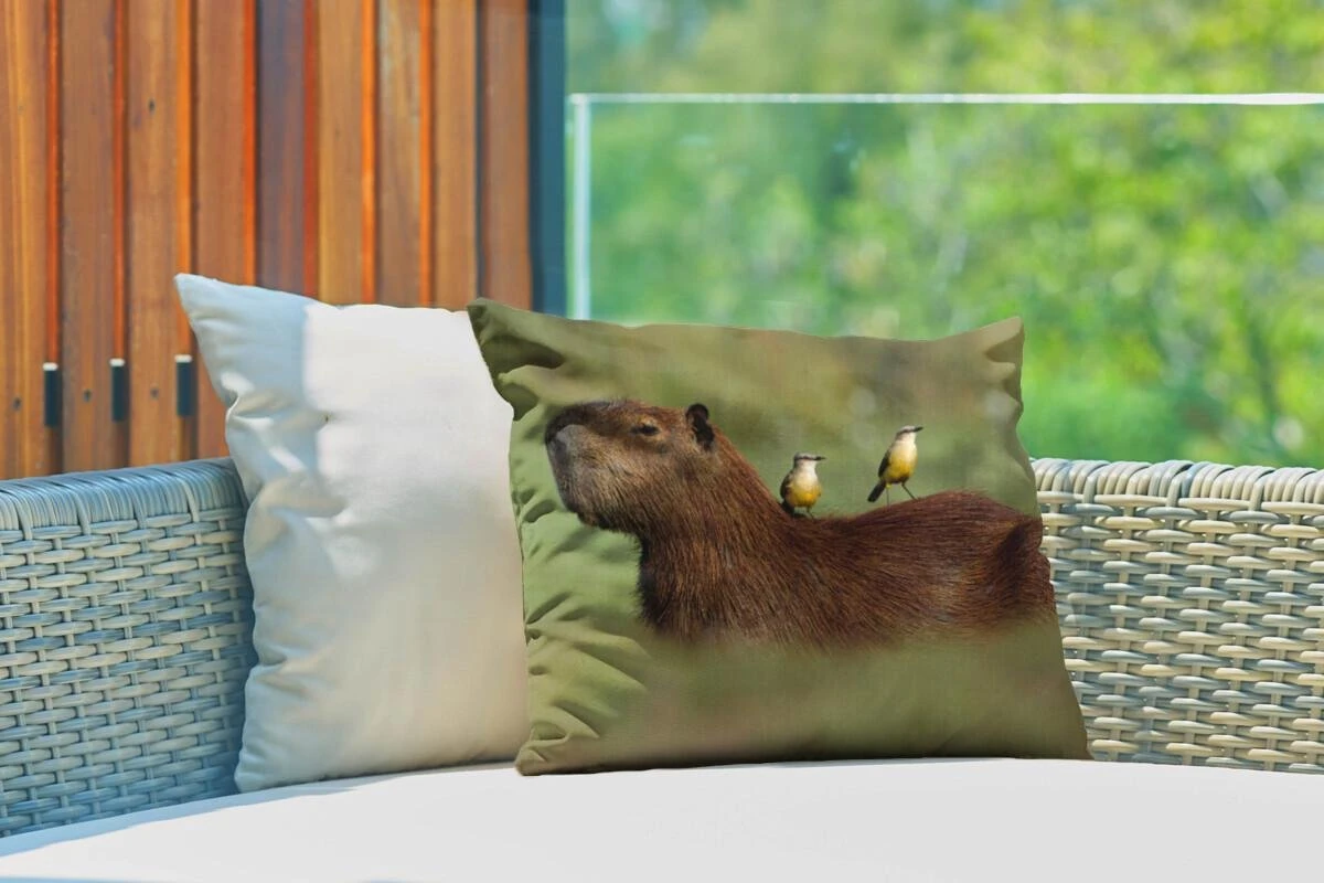 Coussin Sierkussen Capybara Pour L’extérieur – Deux Oiseaux Assis Sur Un Capybara – 50×30 Cm – Coussin De Jardin Rectangulaire Résistant Aux Intempéries / Coussin De Salon De Jardin En Polyester