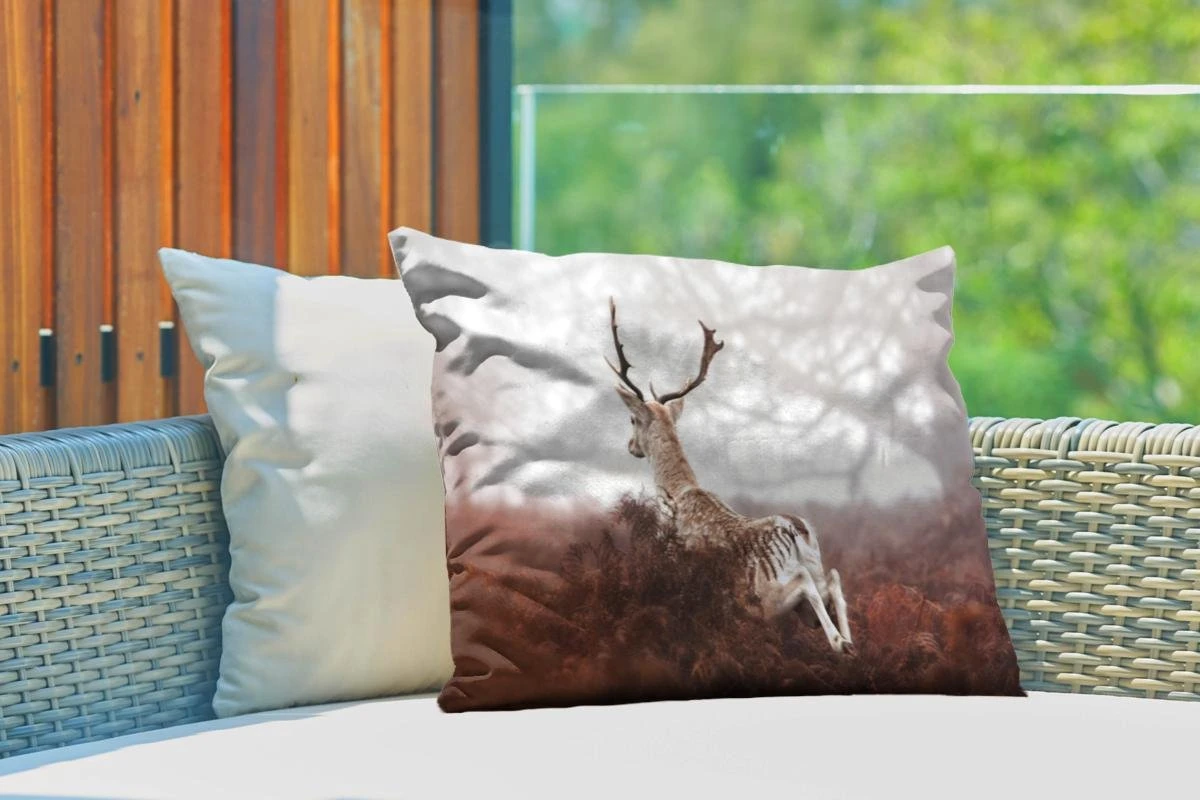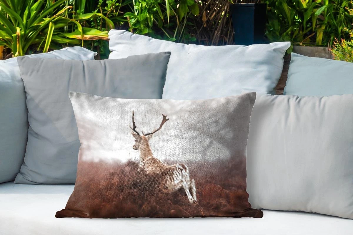 Un cerf sprinte à travers le brouillard et les plantes le matin.