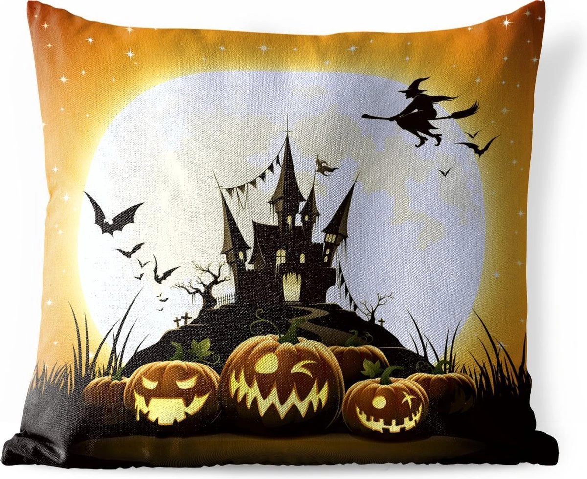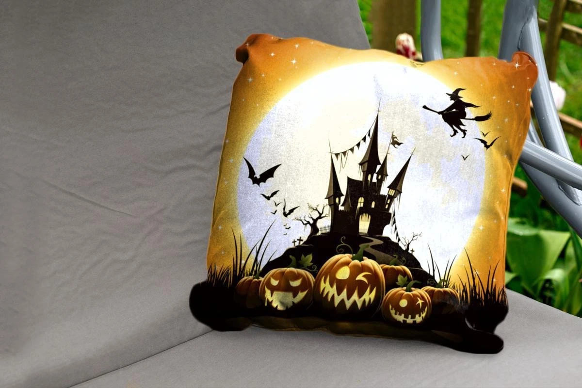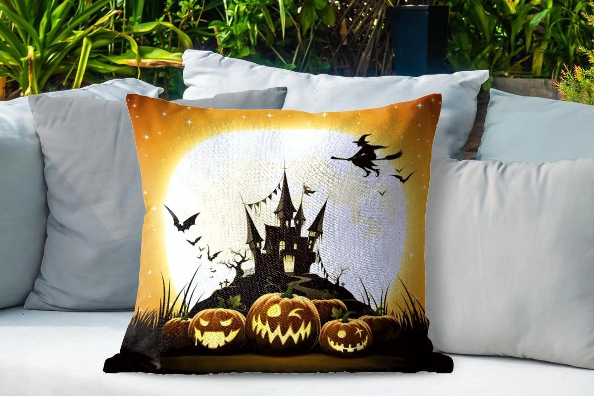 Coussins D’extérieur – Jardin – Une Illustration D’une Sorcière Survolant Un Château Pendant Halloween – 60×60 Cm