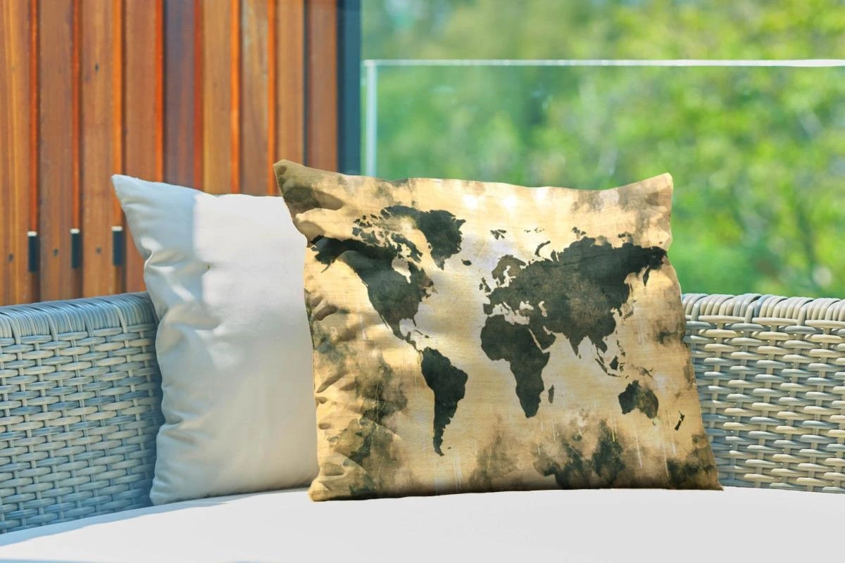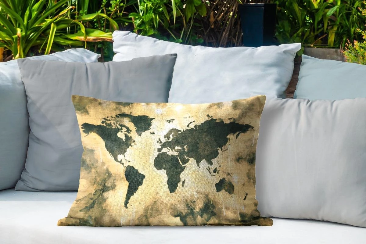 Coussins D’extérieur – Jardin – Wereldkaart Avec Peinture Couleur Gris Foncé Et Sable Sur Fond Texturé – 60×40 Cm