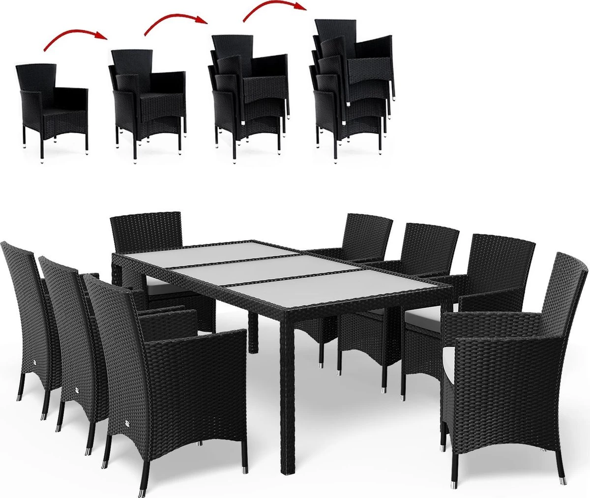 L’ensemble de salon de jardin se compose d’1 table de jardin et de 8 chaises empilables. Les coussins d’assise amovibles de 7 cm d’épaisseur offrent le meilleur confort d’assise possible.