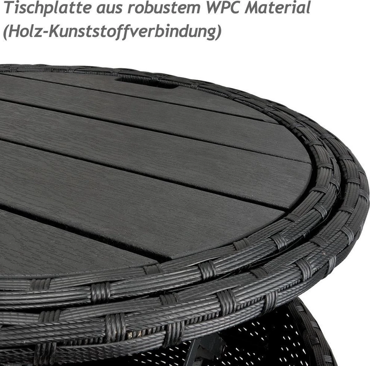 La table télescopique WPC est composée de une composition bois-plastique robuste et peut être étendu rapidement et facilement. Le plateau de table peut également être utilisé comme plateau et a3 antidérapants et réglables en hauteur pieds en plastique pour un placement sûr. La table a également un fond supplémentaire à l’intérieur du polyrattan. L’intérieur peut également être utilisé comme espace de rangement.