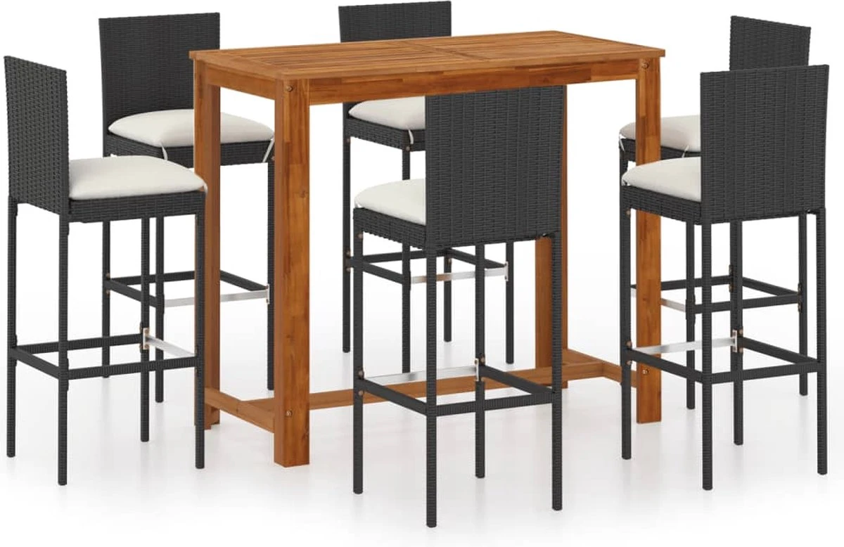 La table est en bois d’acacia massif avec une finition à l’huile, ce qui la rend stable, durable et facile à entretenir. Les tabourets de bar ont un cadre en acier enduit de poudre recouvert de rotin PE résistant aux intempéries, ce qui les rend robustes et faciles à nettoyer. Les coussins d’assise épais et amovibles sont extrêmement confortables. Les housses de coussin avec fermeture à glissière sont facilement amovibles et lavables.