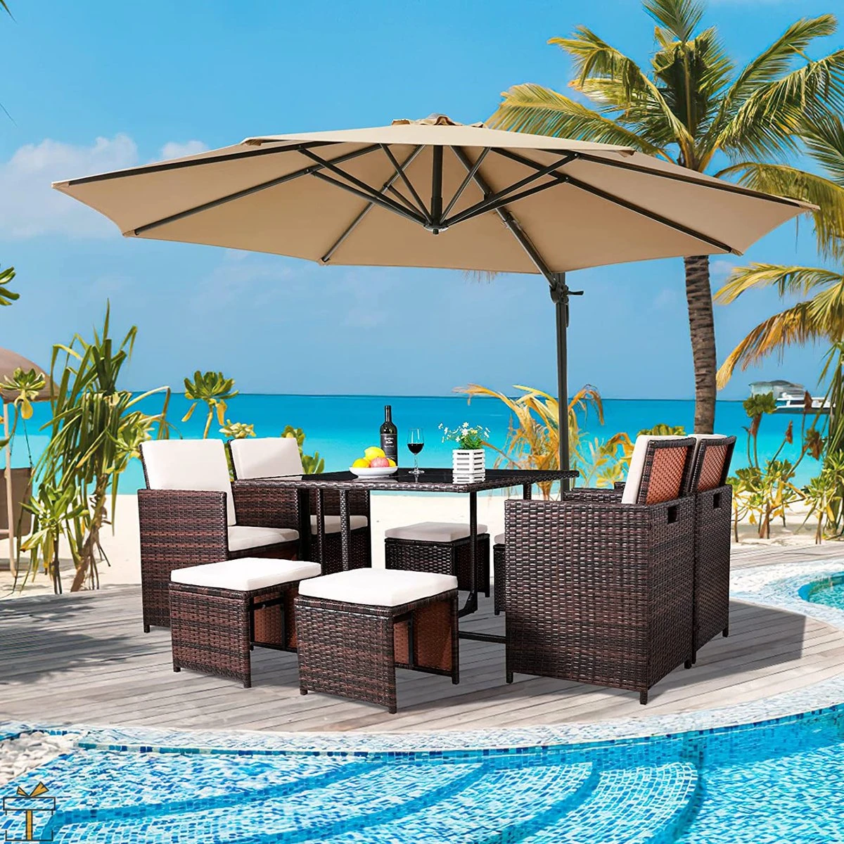 L’ensemble salon de jardin se compose de 4 chaises, 4 tabourets et une belle table avec verre ! Fabriqué en acier robuste et en rotin léger. Bien sûr, leoreillers moelleux sur lequel on peut s’asseoir pendant des heures. les couvertures des oreillers sont mêmelavable † C’est l’un des meilleurs ensembles du moment.