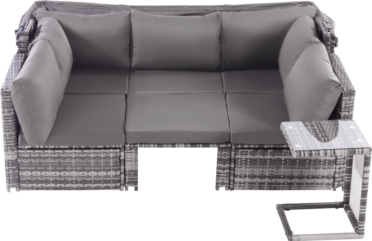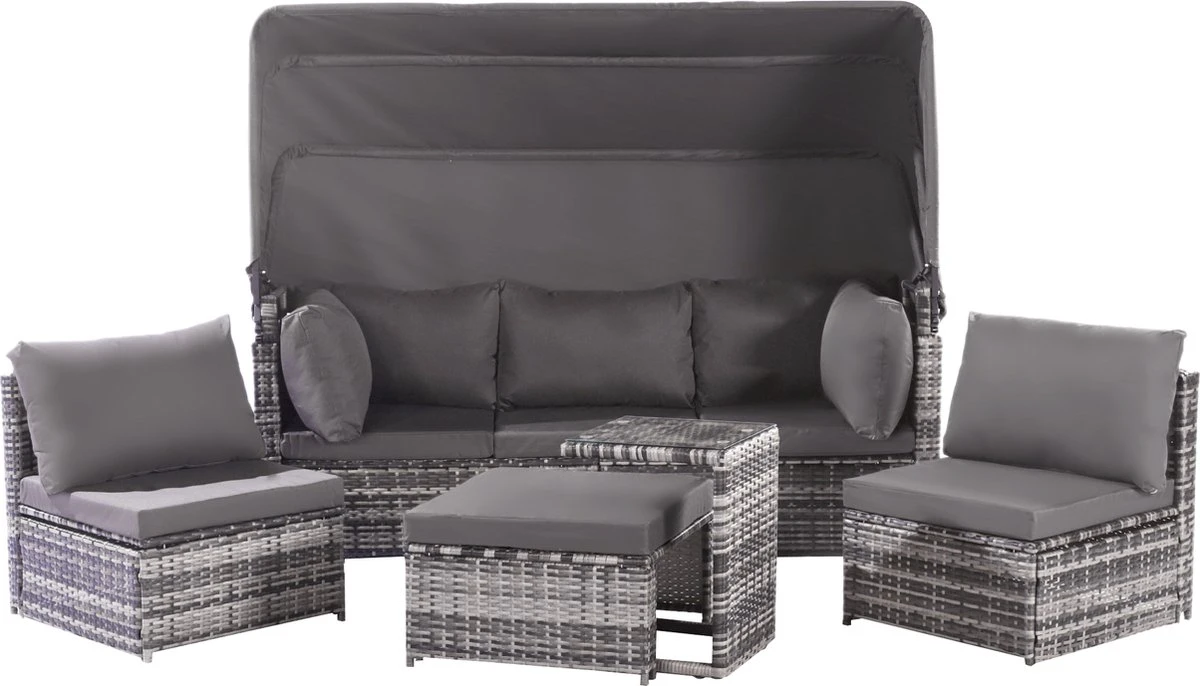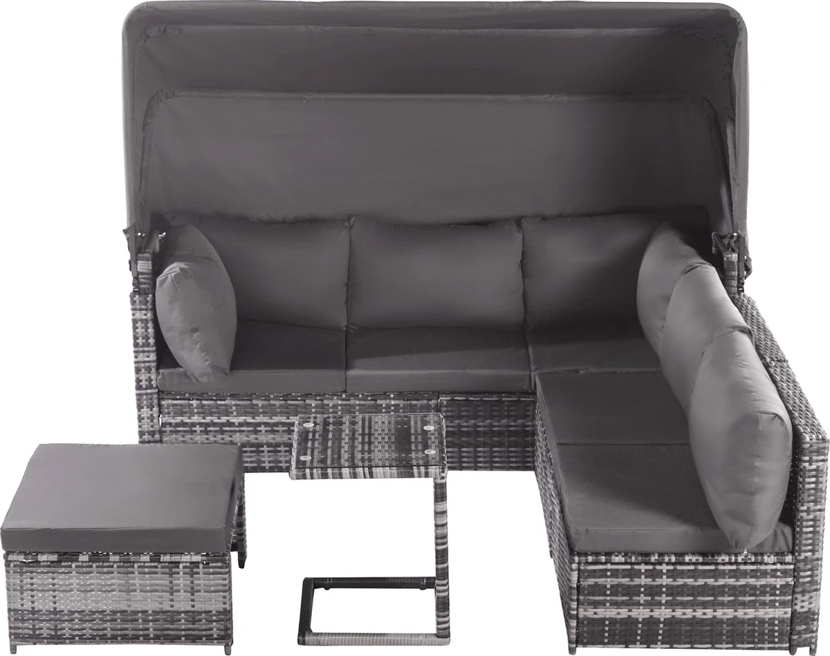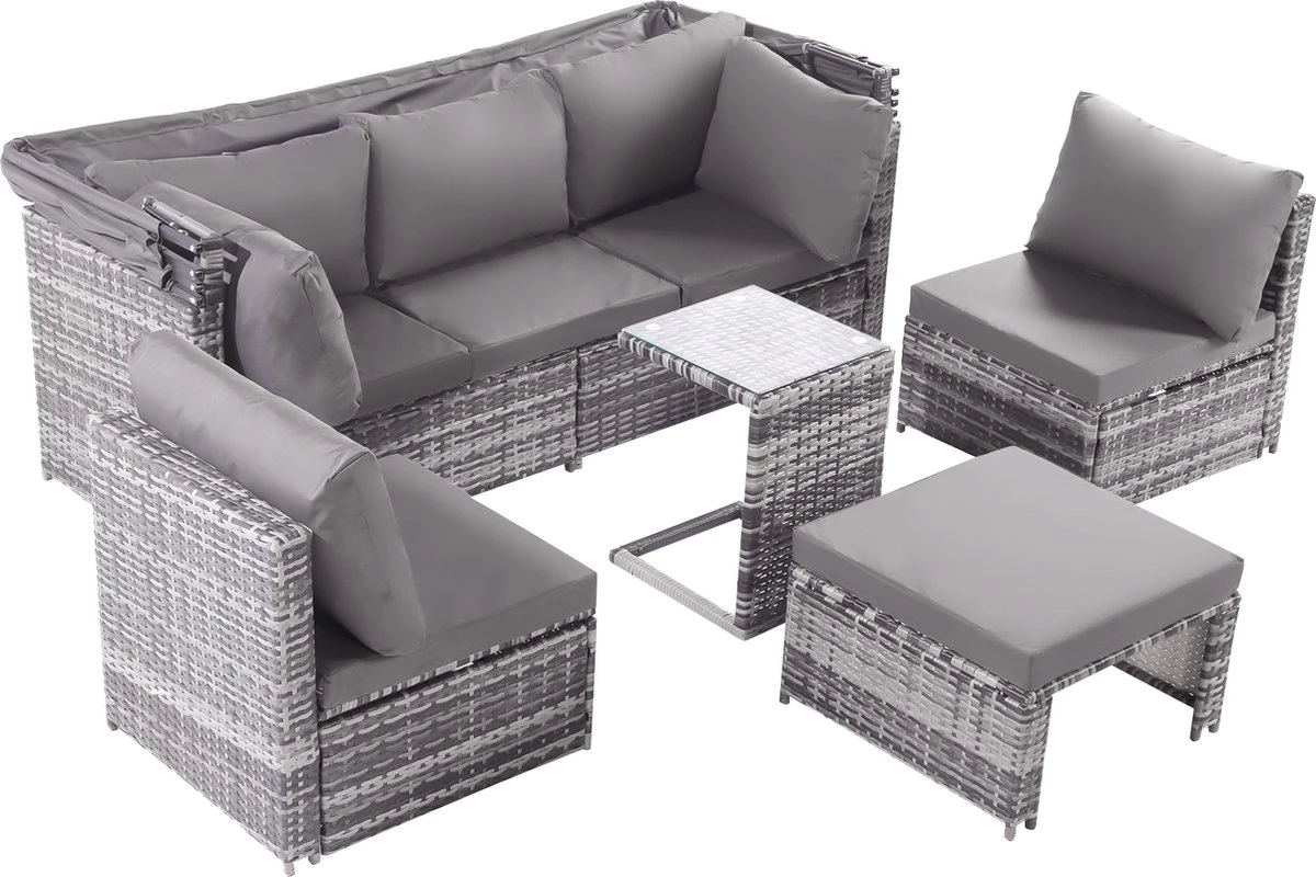 Contenu de l’emballage : 1 canapé 3 places, 2 fauteuils simples, 1 pouf, 1 table d’appoint, 1 auvent, 13 coussins, dans 3 boîtes.