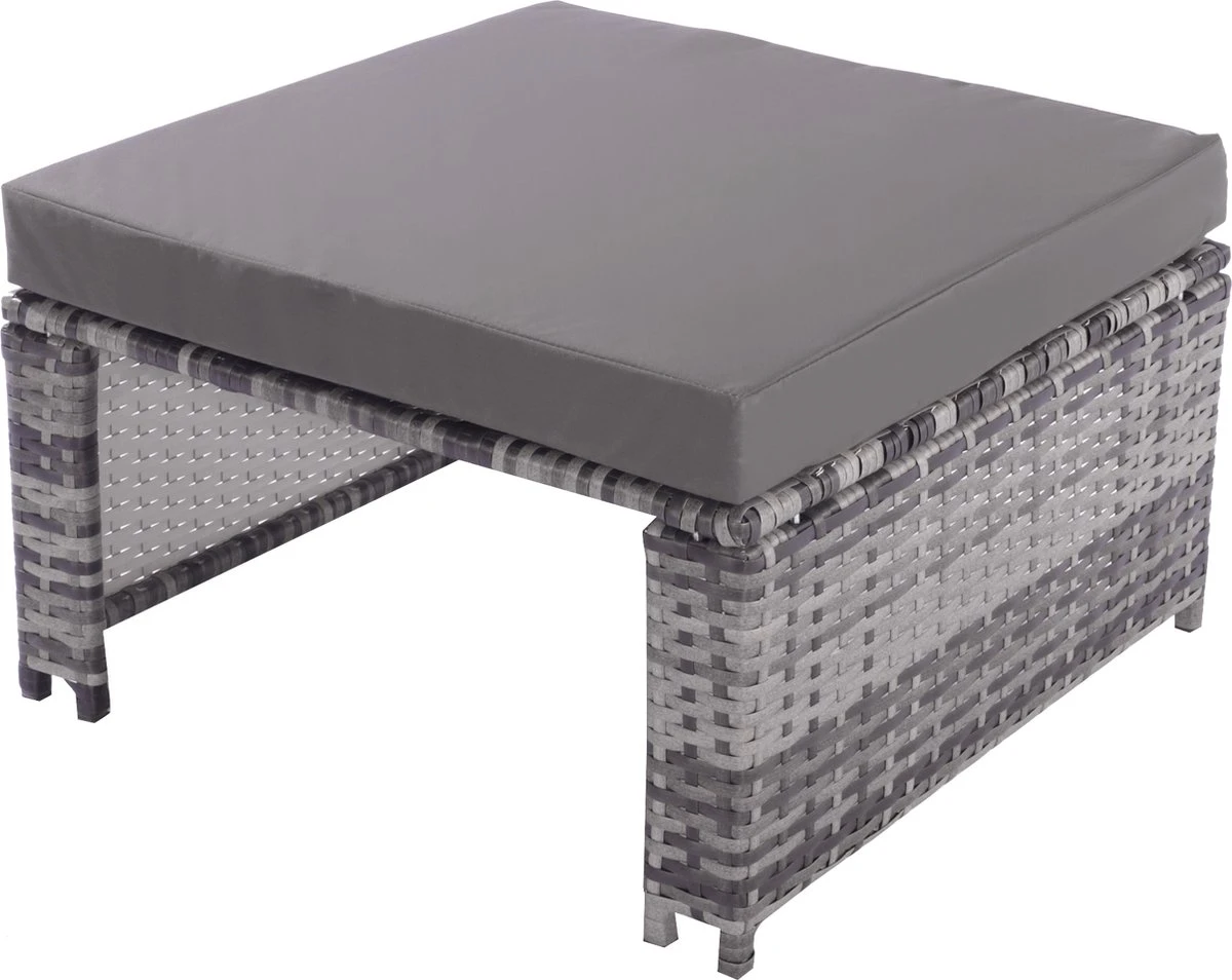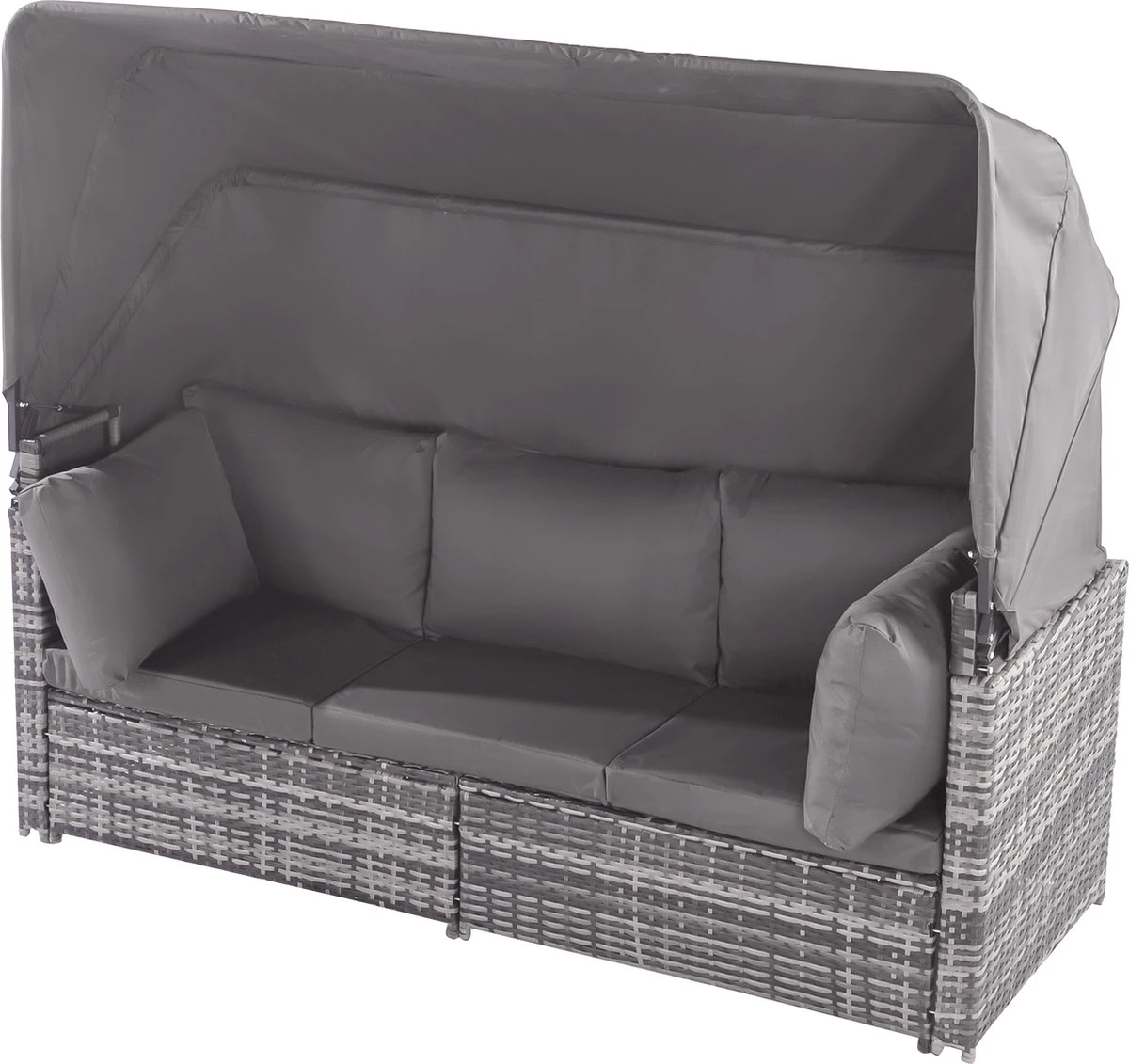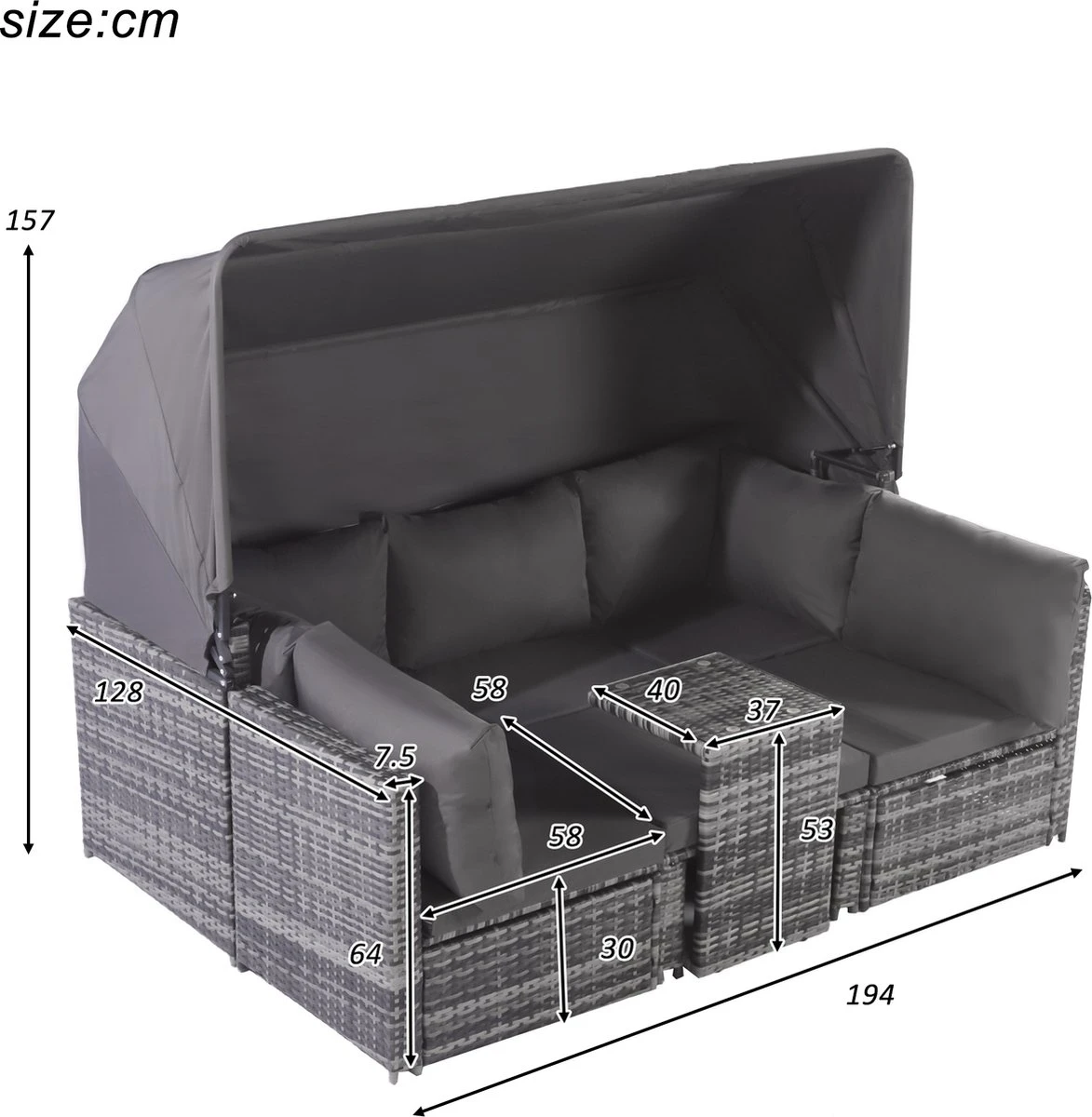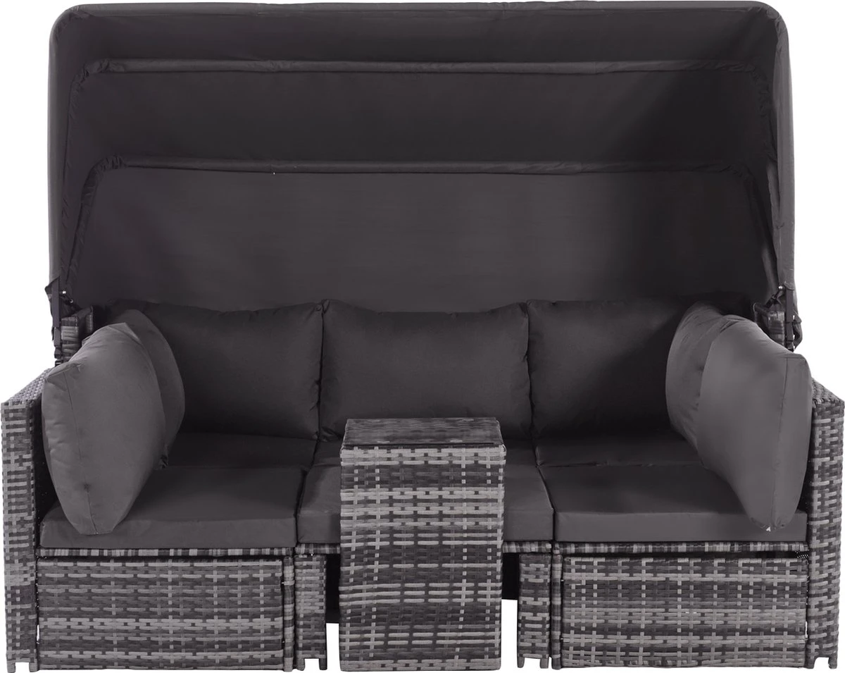 Contenu de l’emballage : 1 canapé 3 places, 2 fauteuils simples, 1 pouf, 1 table d’appoint, 1 auvent, 13 coussins, dans 3 boîtes.