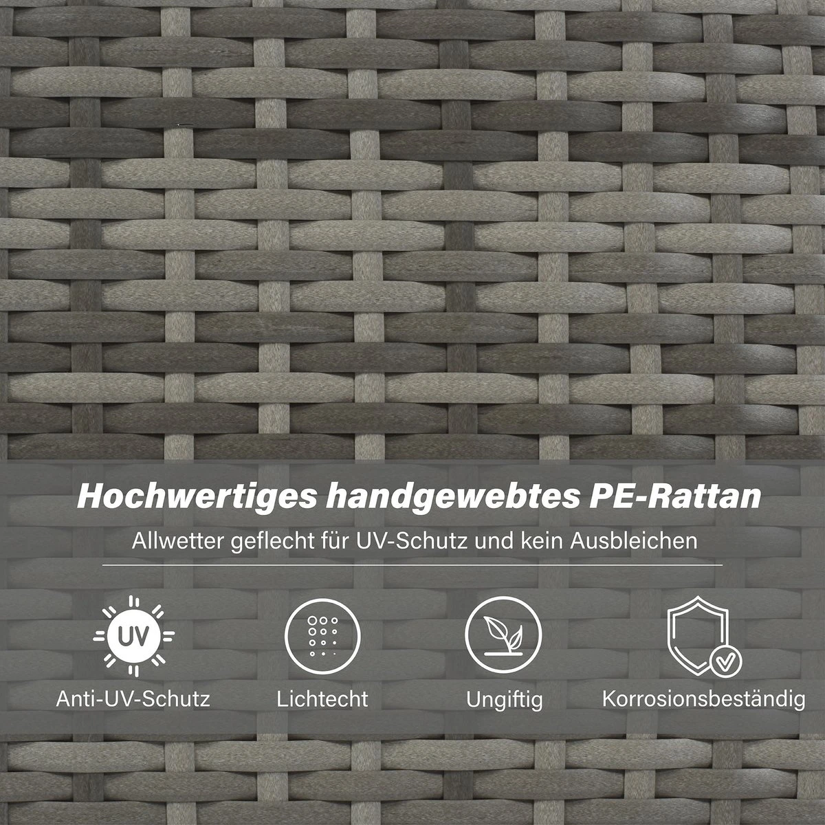 La construction robuste de cet ensemble de meubles de jardin est due au cadre en fer enduit de poudre et au rotin PE soigneusement sélectionné. Le cadre transversal inférieur est conçu pour résister au vent et à la pluie tout au long de l’année, gardant votre ensemble de meubles sûr et robuste.