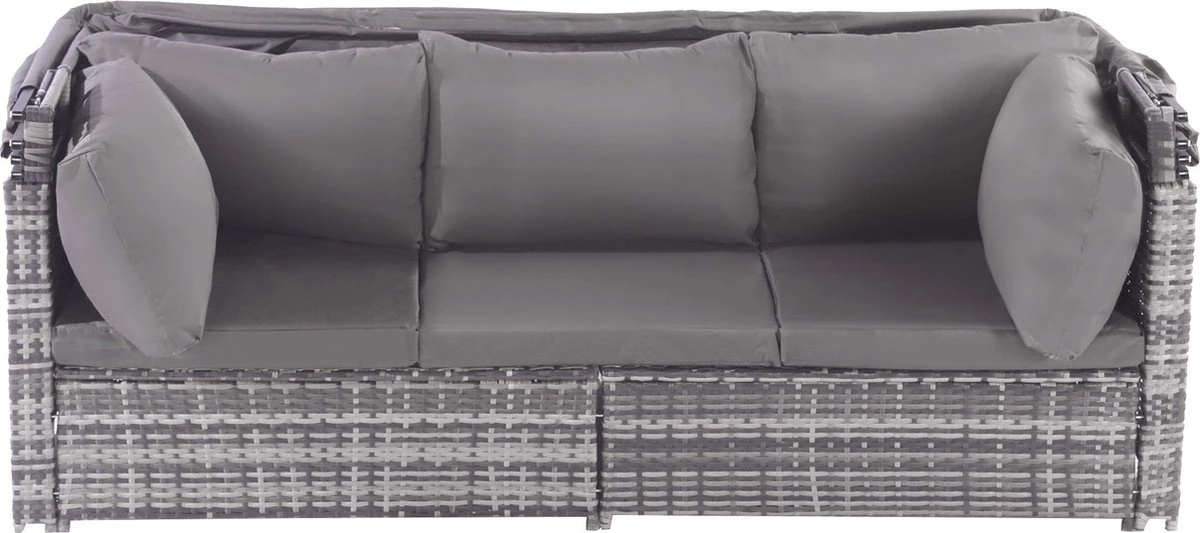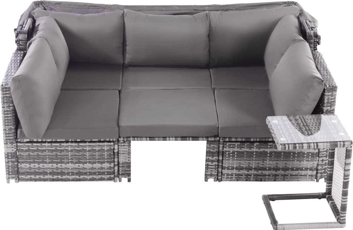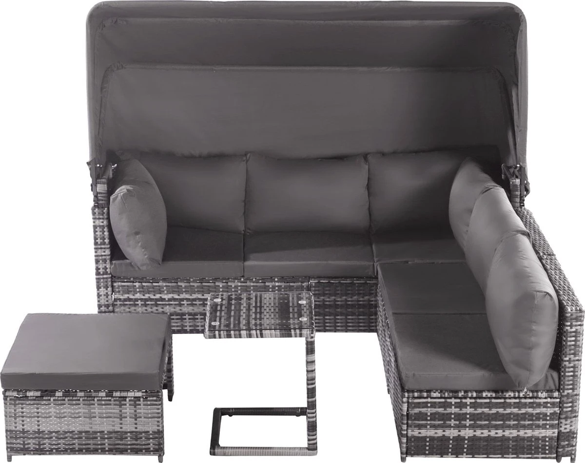 Avec notre pare-soleil rétractable, vous pouvez profiter d’une protection UV efficace, ce qui est la solution parfaite pour les journées ensoleillées. Le rotin résistant aux intempéries est résistant au vieillissement UV, ce qui signifie que l’ensemble de meubles durera longtemps. Les coussins de 8 cm vous offrent un confort ultime et les housses lavables garantissent que votre ensemble de meubles reste toujours propre. Le plateau en verre trempé crée une atmosphère élégante et estivale dans votre jardin.