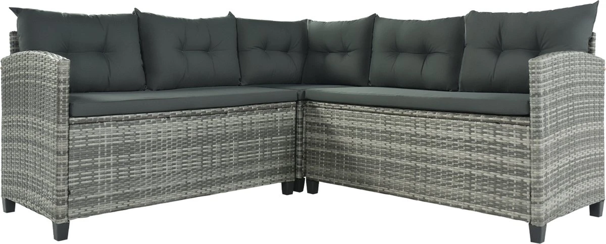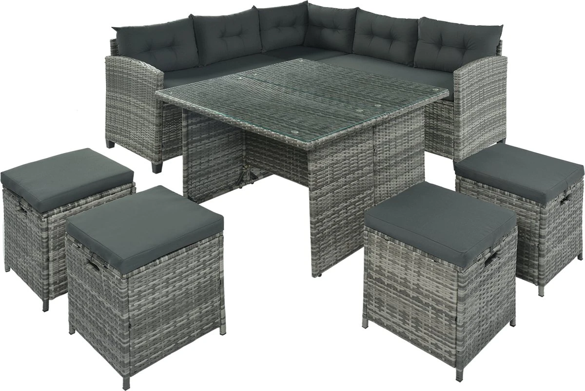LE PACKAGE COMPREND : 2 x canapés, 1 x chaise d’angle, 1 x dessus de table en verre, 4 x poufs, 13 x coussins, dans 3 boîtes.