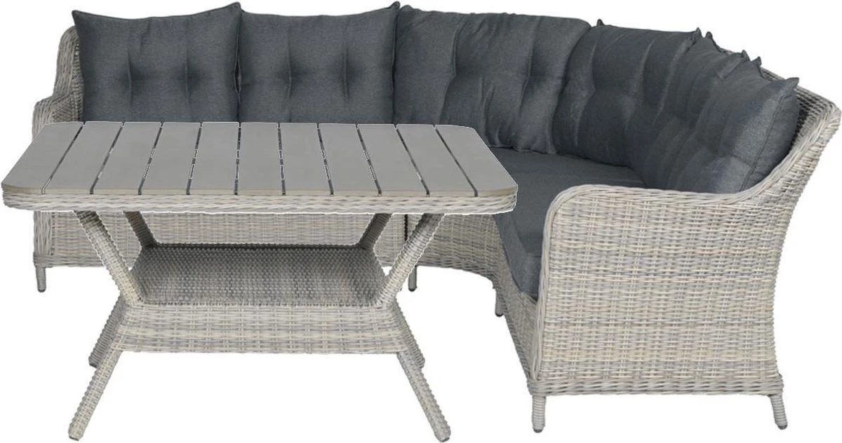 Vous n’êtes pas sûr entre un ensemble de salon ou un ensemble de jardin avec une table haute de jardin avec plusieurs chaises? Alors jetez un œil à l’ensemble de salle à manger Nova Lounge de la marque de qualité Garden Impressions . Cet ensemble offre le meilleur des deux mondes: se prélasser et dîner confortablement. Cet ensemble de salle à manger de salon comprend des coussins d’assise et de dossier merveilleusement confortables et une table de jardin haute pratique. Cet ensemble de salle à manger spacieux Nova est composé d’un cadre en aluminium sans entretien et d’un fil tressé en plastique en osier demi-rond résistant aux intempéries. La couleur de cet ensemble est le saule vintage, c’est une belle teinte naturelle mélangée. Le fil a une épaisseur d’au moins 5 mm, ce qui offre plus de résistance et un fil de tressage plat. Le fil de tressage en osier est un produit robuste et durable, vous apprécierez donc l’ensemble de salle à manger Nova pour les années à venir. L’ensemble est bien sûr livré avec des coussins de salon. Les coussins sont en polyester de haute qualité avec un revêtement hydrofuge. Les coussins de siège ont une fermeture à glissière, de sorte que les housses peuvent être facilement lavées à la main. Les coussins de dossier ont des coutures supplémentaires qui rappellent le tissu à deux endroits, ce qui crée un look classique. Les coussins ne sont pas 100% imperméables, mais ont un revêtement hydrofuge. C’est particulièrement pratique lorsque vous renversez, par exemple, une boisson est renversée sur le coussin. Vous pouvez facilement essuyer à nouveau la boisson. Après utilisation, les coussins peuvent être rangés dans le hangar ou dans une taie d’oreiller. L’ensemble de salle à manger Nova Lounge se compose d’un canapé d’angle avec un coin arrondi et d’une table haute de jardin. Le coin arrondi du canapé lounge vous garantit une assise confortable dans le coin. Les bancs de salle à manger sont livrés entièrement assemblés et se fixent facilement les uns aux autres grâce aux clips inclus. Les pieds de la table de jardin sont faciles à assembler. La table de jardin magnifiquement finie a un dessus de table en polywood. Polywood a un aspect bois luxueux et est très pratique. C’est parce qu’il est en plastique résistant aux intempéries et facile à entretenir. La série Nova est une série d’ensembles de salon populaire. Les éléments suivants sont disponibles du saule vintage Nova : élément central (pour agrandir le canapé du salon), chaise de salle à manger ou tabourets pratiques. Dimensions du montage: L 237 x L 237 x H 85 cm Dimensions de la table: L 126,5 x L 126,5 x H 70 cm Osier saule vintage semi-rond (couleur sable) avec cadre intérieur en aluminium Coussins épais polyester noir.