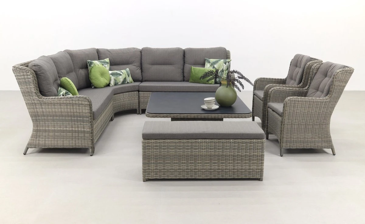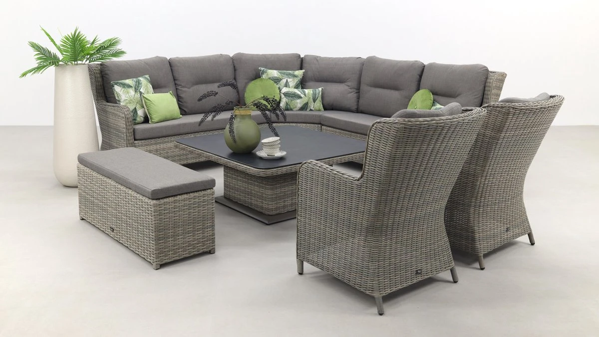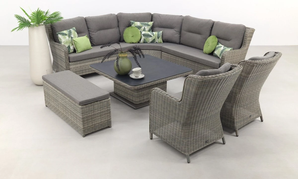 La particularité de cet ensemble de salle à manger est que la table peut être ajustée en hauteur. Cela garantit que la table est une table basse normale en position basse et une table à manger de salon en position haute. L’ensemble de salle à manger lounge Sandigo dispose également d’un module d’angle XL, ce qui vous assure une place supplémentaire dans le canapé d’angle. Les deux chaises et le canapé d’appoint complètent l’ensemble de salon.