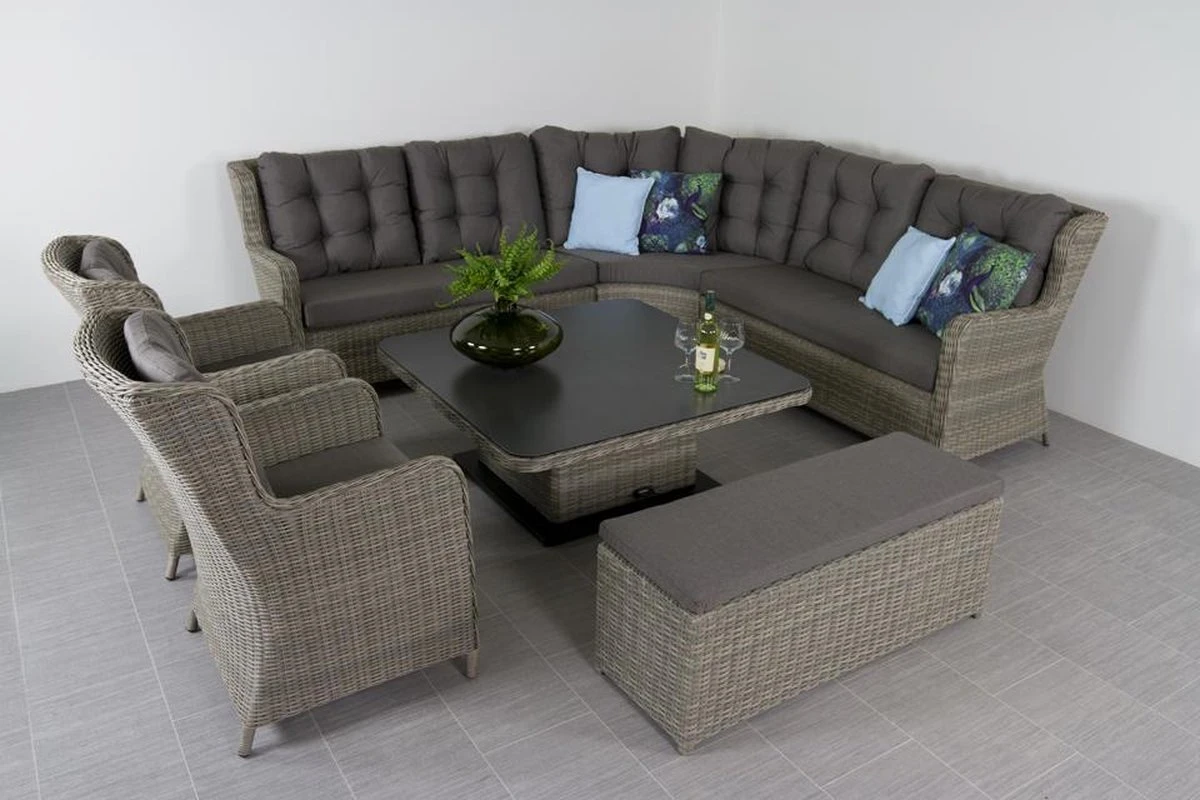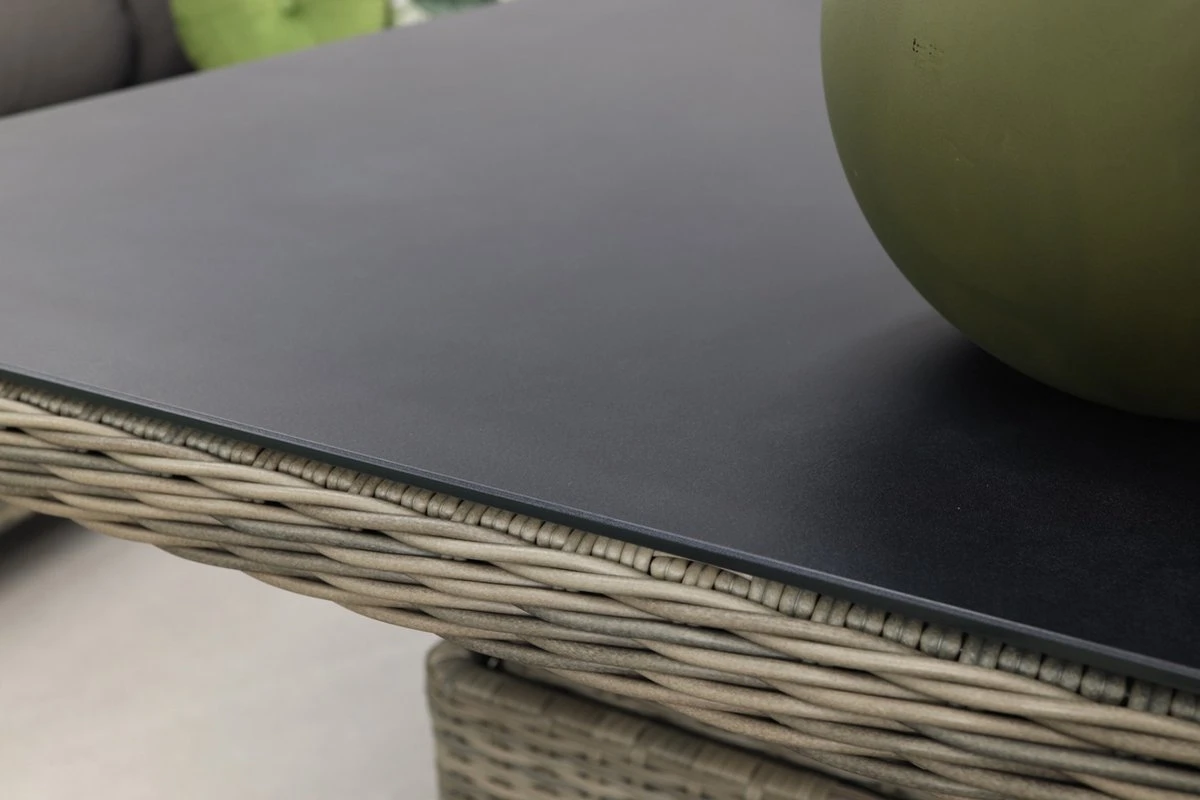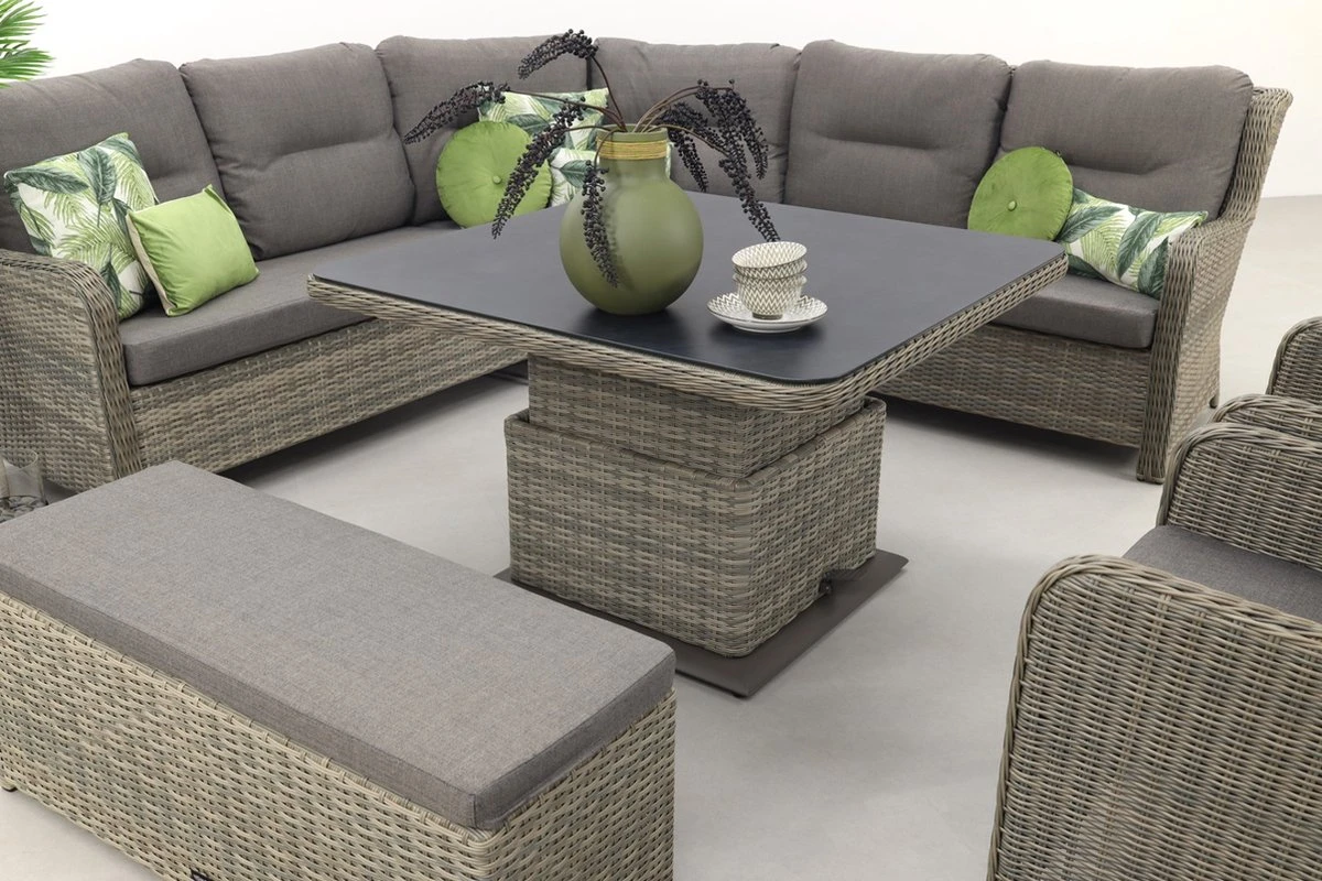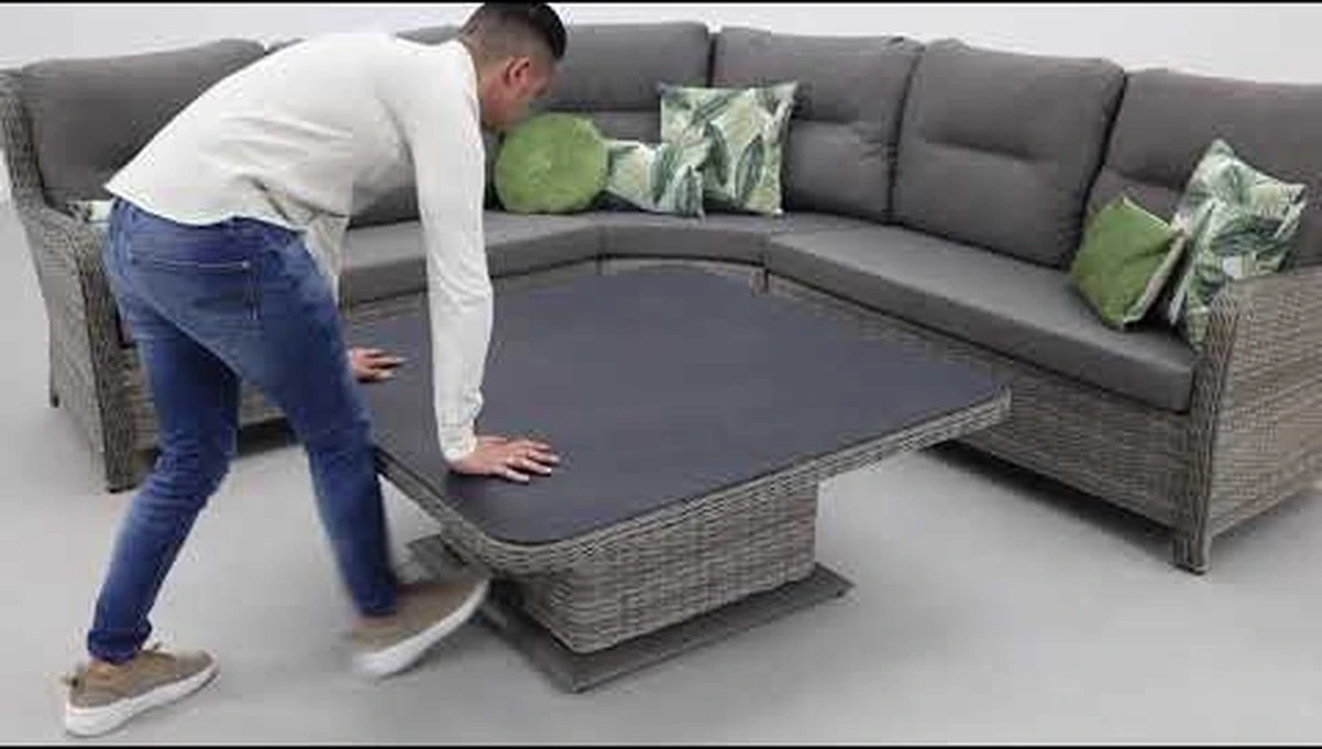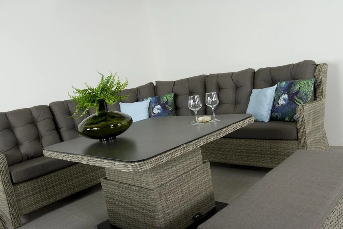 La table lounge de l’ensemble lounge Sandigo est réglable en hauteur. Cela signifie que la table est en position basse, elle fait alors 48 cm. haut, peut être utilisé comme une table basse normale. En position haute, la table mesure 74 cm. haute, la table peut être utilisée comme table à manger de salon. Cela garantit que la table de salon du canapé d’angle se transforme en un véritable ensemble de salle à manger de salon. La hauteur de la table est réglée au moyen d’une pédale sur le côté. Le plateau de la table est en pierre de pulvérisation.