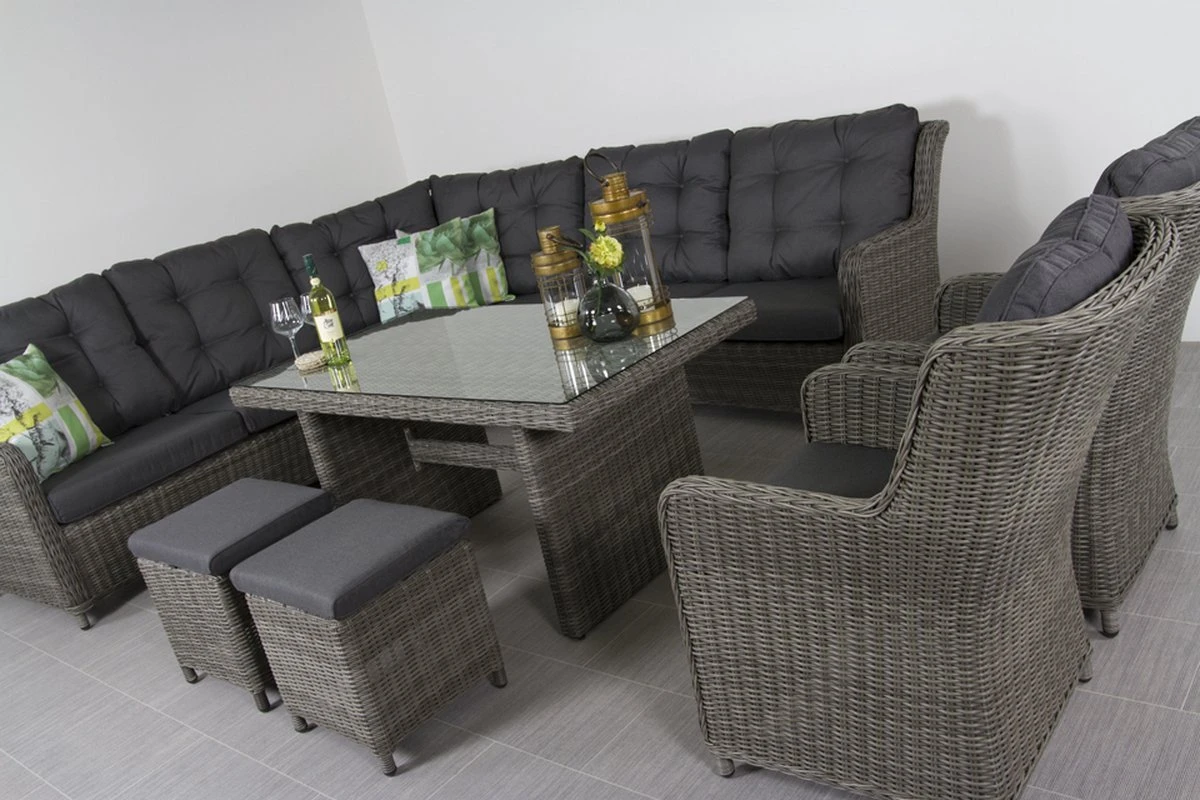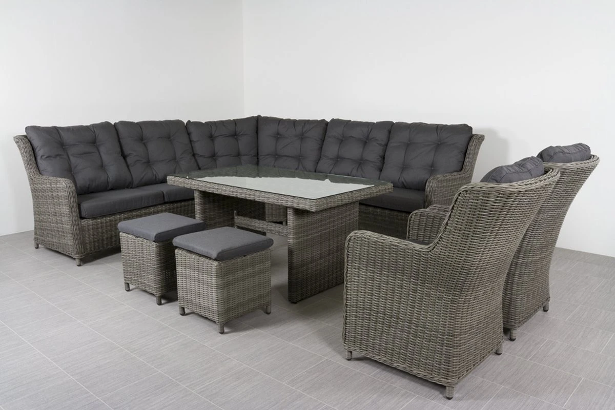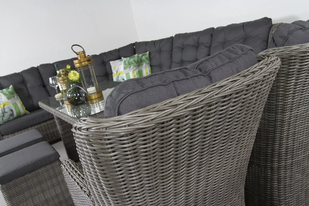 Ensemble de salle à manger de salon Richmond avec deux chaises de jardin. L’ensemble est exécuté dans la couleur gris cendré. Il s’agit d’une couleur gris foncé qui se marie bien avec les coussins de couleur anthracite. L’ensemble de salle à manger de salon Richmond réunit détente et repas en un seul ensemble. L’ensemble de salon est parfaitement adapté pour se prélasser, mais avec la table haute de salon, il est également possible de dîner dans l’ensemble de salon. Les deux chaises de jardin à manger complètent l’ensemble. L’élément d’angle XL offre un siège supplémentaire dans le canapé d’angle.