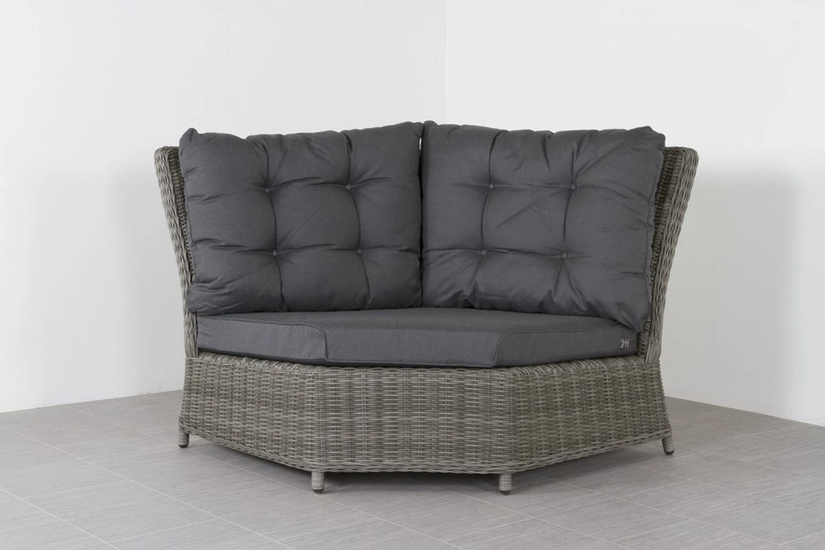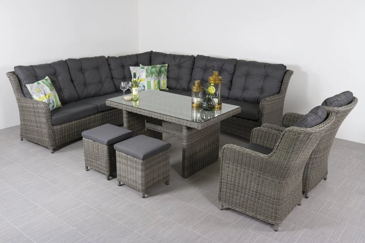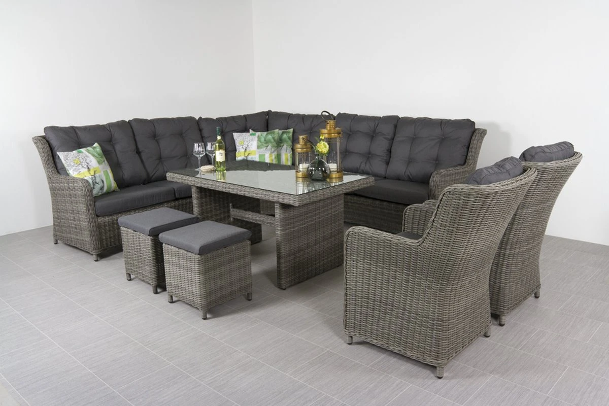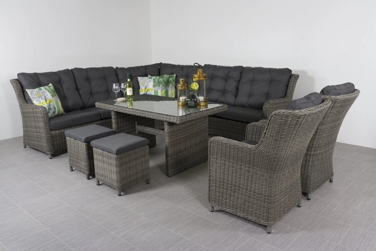 Ensemble de salle à manger de salon Richmond avec deux chaises de jardin. L’ensemble est exécuté dans la couleur gris cendré. Il s’agit d’une couleur gris foncé qui se marie bien avec les coussins de couleur anthracite. L’ensemble de salle à manger de salon Richmond réunit détente et repas en un seul ensemble. L’ensemble de salon est parfaitement adapté pour se prélasser, mais avec la table haute de salon, il est également possible de dîner dans l’ensemble de salon. Les deux chaises de jardin à manger complètent l’ensemble. L’élément d’angle XL offre un siège supplémentaire dans le canapé d’angle.