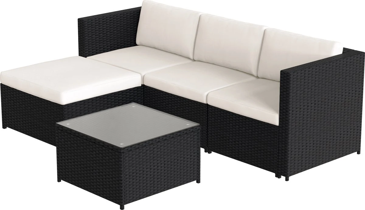 L’ensemble de salon est équipé d’un canapé lounge, d’un tabouret/pouf, d’une table basse avec un plan de travail en verre.
