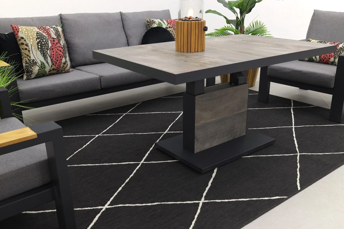 Cette table de jardin élégante est faite de matériaux de haute qualité et est réglable en hauteur. La position la plus haute est de 72 cm. haut et la position la plus basse est de 49 cm. haut. La hauteur du plateau de table est réglable en continu et fonctionne très facilement. Vous pouvez régler la hauteur en appuyant sur le levier. La table de jardin Jersey a un cadre en aluminium. Le cadre en aluminium est recouvert d’un revêtement protecteur en poudre résistant aux rayures et aux chocs. L’avantage de l’aluminium est que ce matériau est léger, ne se corrode pas et nécessite peu d’entretien. En conséquence, vous apprécierez cette table de jardin élégante pour les années à venir. La céramique a été choisie comme plateau de table. La céramique est une pierre dure et convient donc parfaitement comme plateau de table. Comme le cadre, le plateau de table nécessite également peu d’entretien. Un nettoyage Af avec un chiffon humide est suffisant. Les pieds de la table Jersey Deluxe sont finis avec des plaques en céramique du même aspect que le plateau de la table.