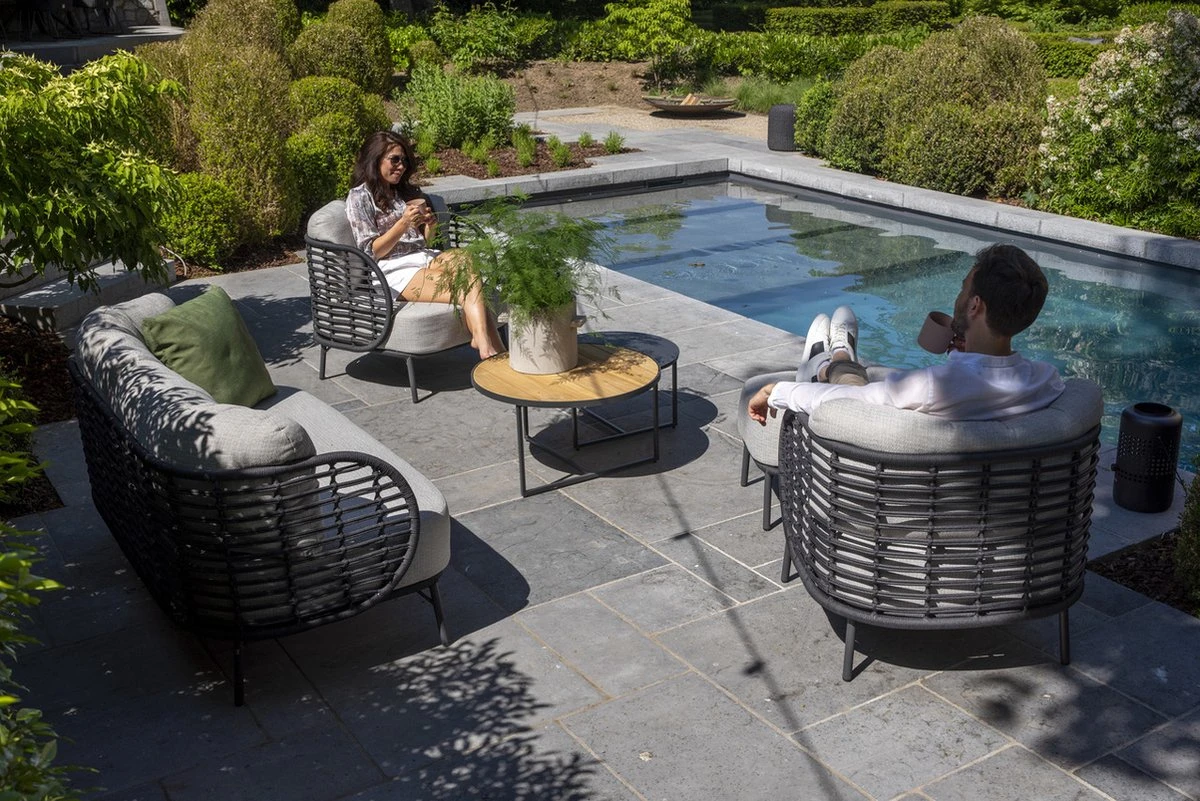 L’ensemble salon canapé fauteuil Fabrice est de la marque 4 Seasons Outdoor. L’ensemble lounge Fabrice se compose d’un canapé lounge, de deux fauteuils lounge et d’une table lounge Yoga ronde de 90 cm. Nous accordons une garantie de 5 ans sur l’ensemble de salon Fabrice.