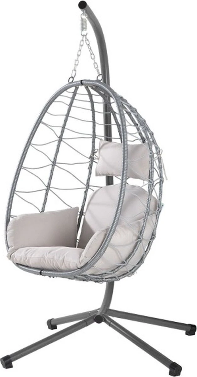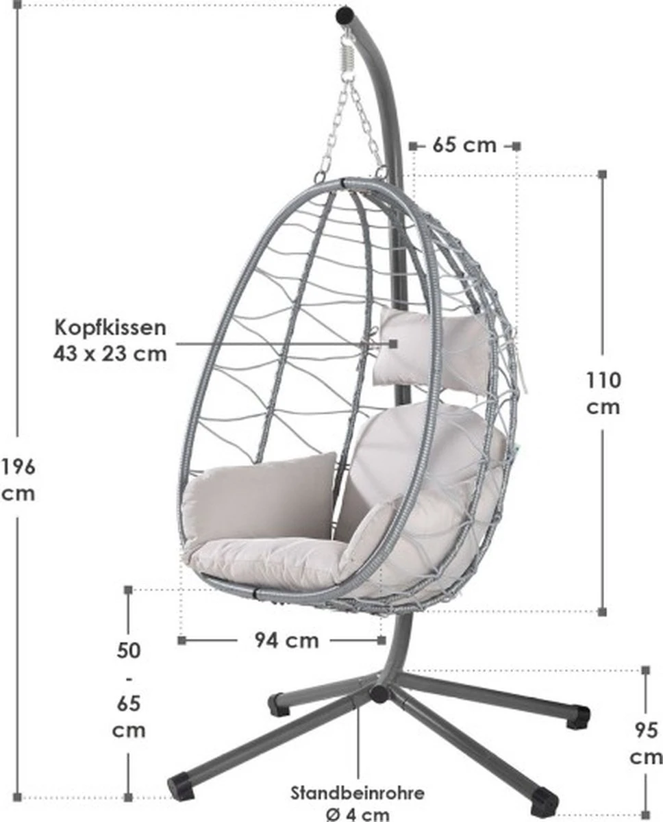 Le cadre en fer en forme de C d’environ 5 cm d’épaisseur avec un support en forme de X assure un plaisir de balancement sans soucis. Le revêtement en poudre sur les tubes stables protège contre les rayures disgracieuses. Les 4 pieds en caoutchouc du fauteuil suspendu assurent une position ferme et protègent également le sol.