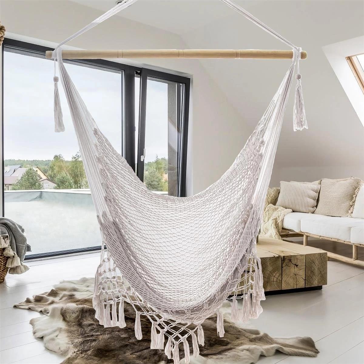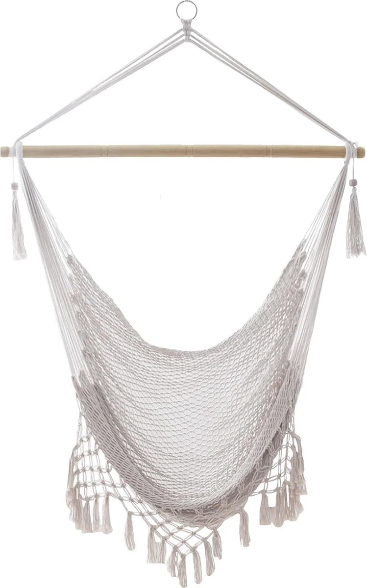 Le fauteuil suspendu style macramé est très esthétique et sa couleur beige en fait un fauteuil parfait
