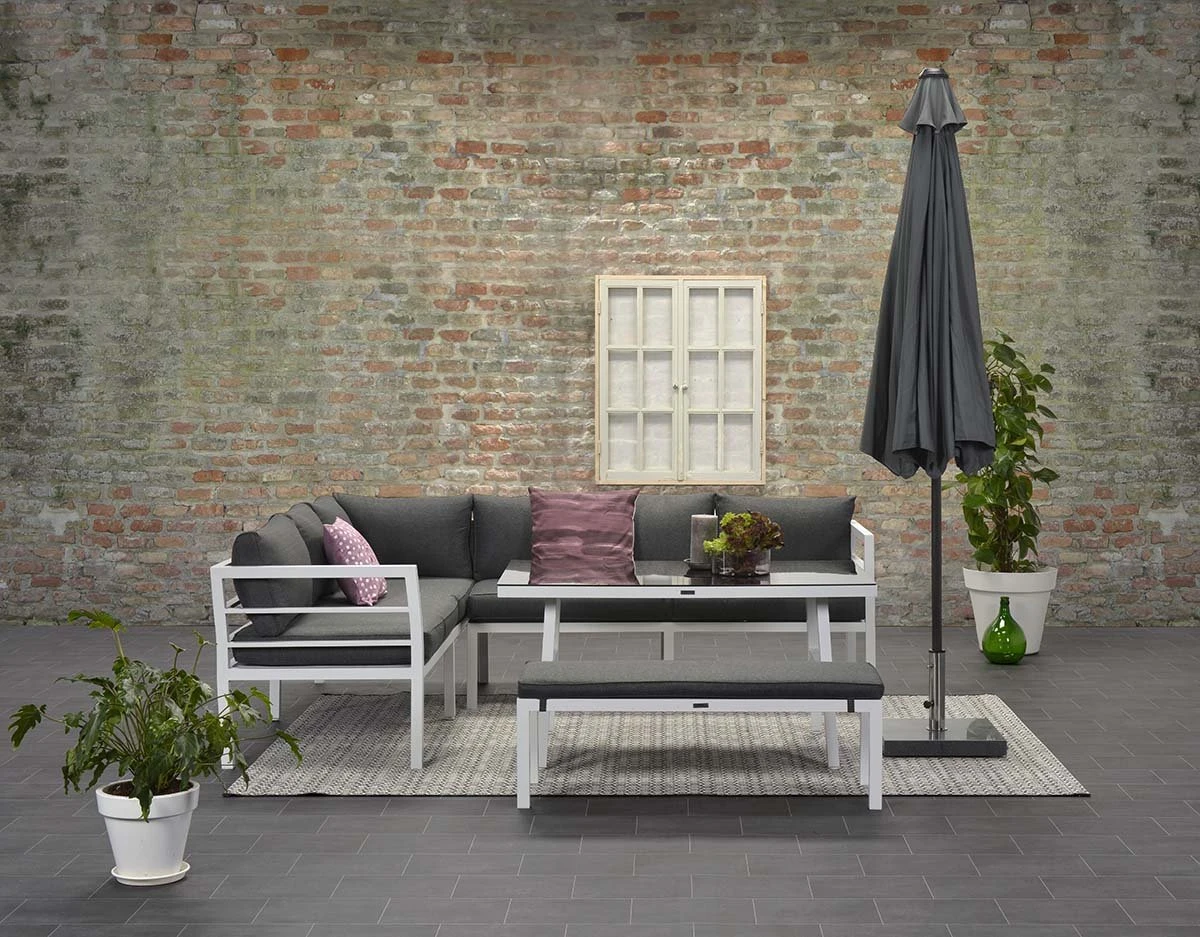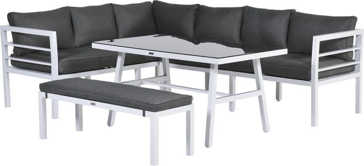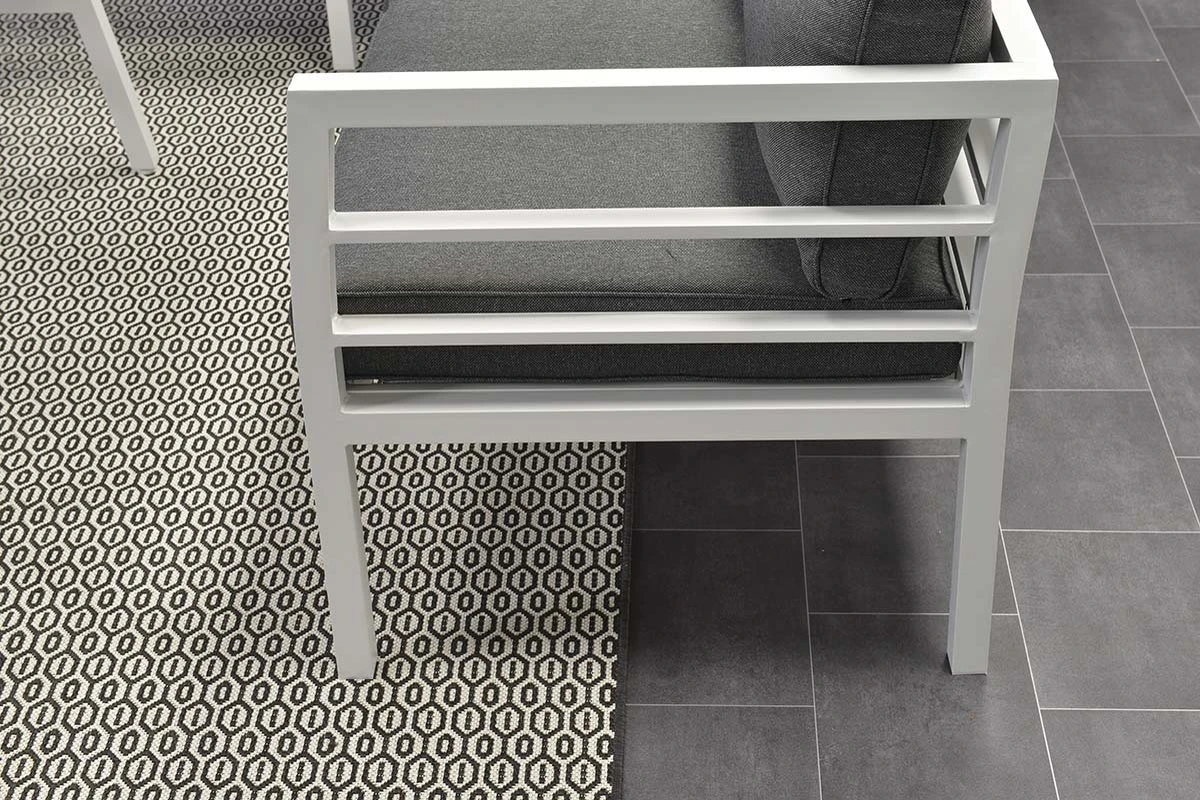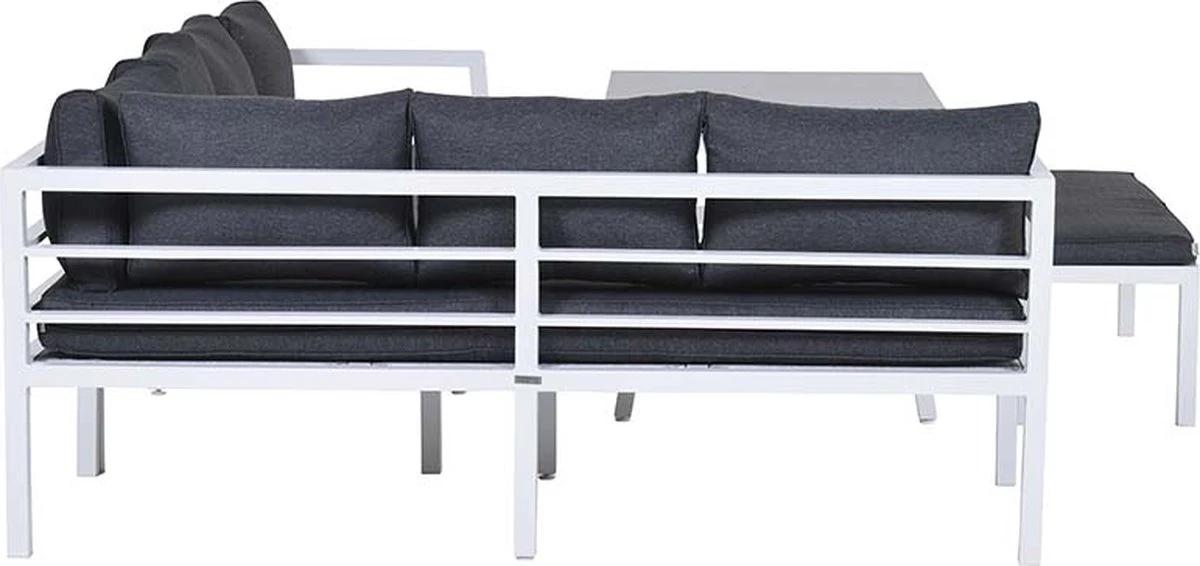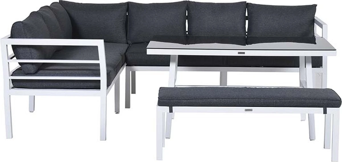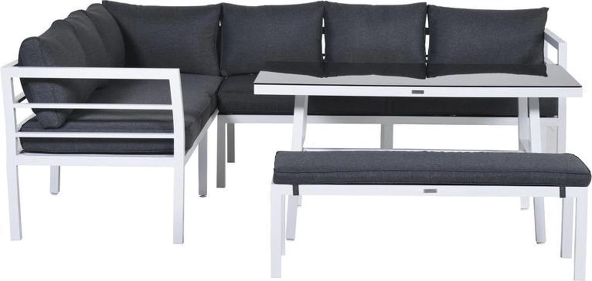 Cet ensemble de salon complet est fait d’aluminium sans entretien et résistant aux intempéries avec un revêtement en poudre blanc robuste. Les coussins fournis sont en polyester de haute qualité. Les coussins de couleur noire ont une fermeture éclair pour que les housses puissent être facilement lavées à la main. Les coussins ne sont pas imperméables et peuvent être rangés dans la remise ou le casier à coussins après utilisation. La table spacieuse est en aluminium avec une plaque de verre trempé.