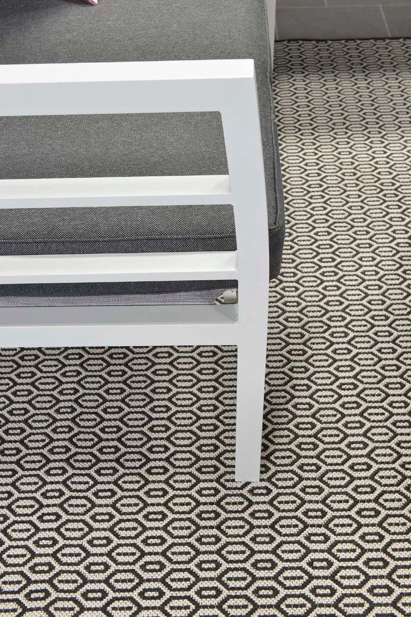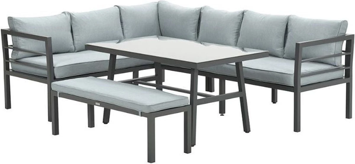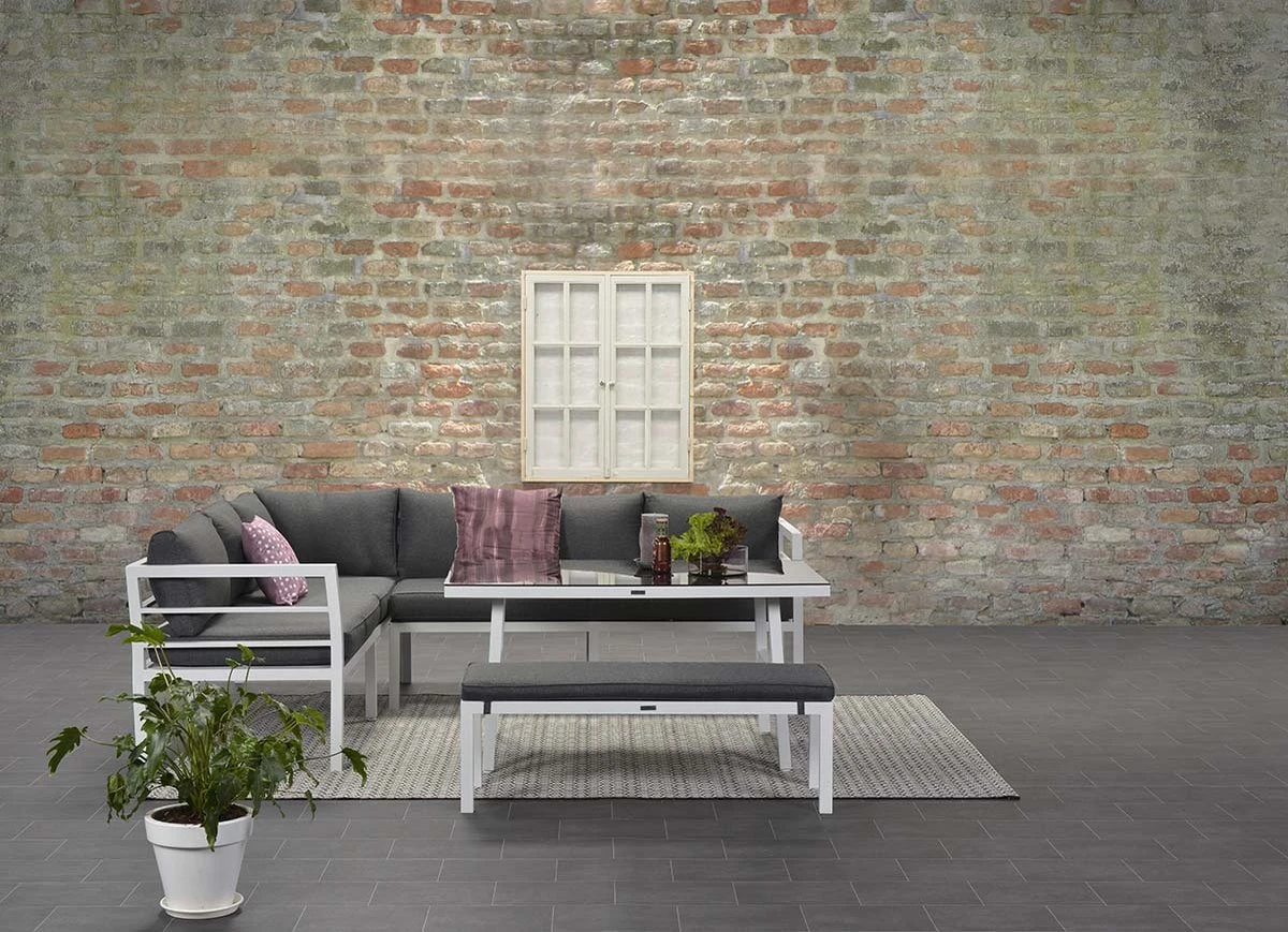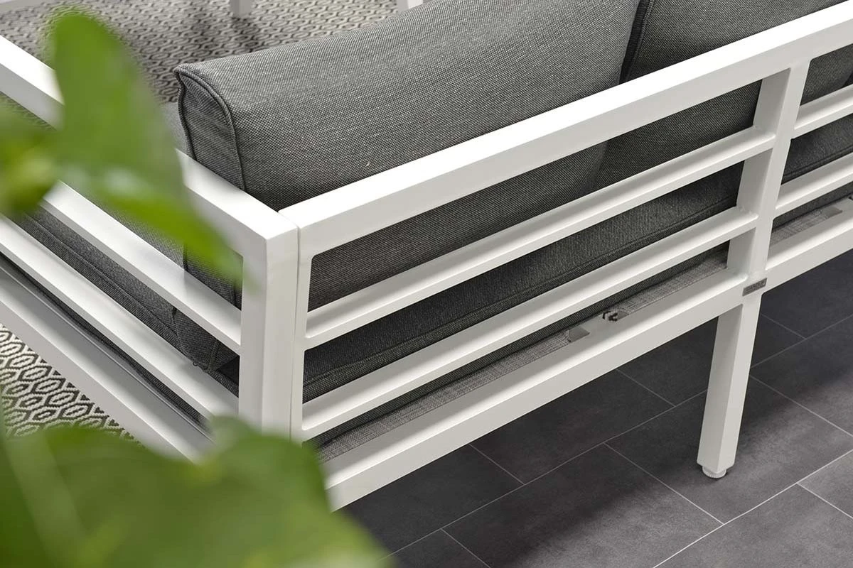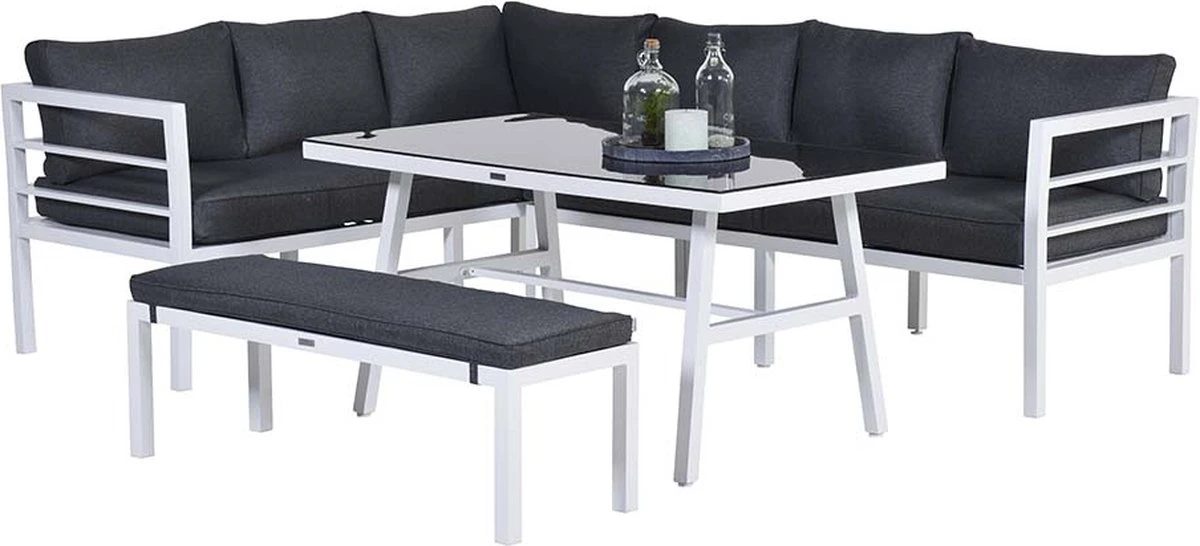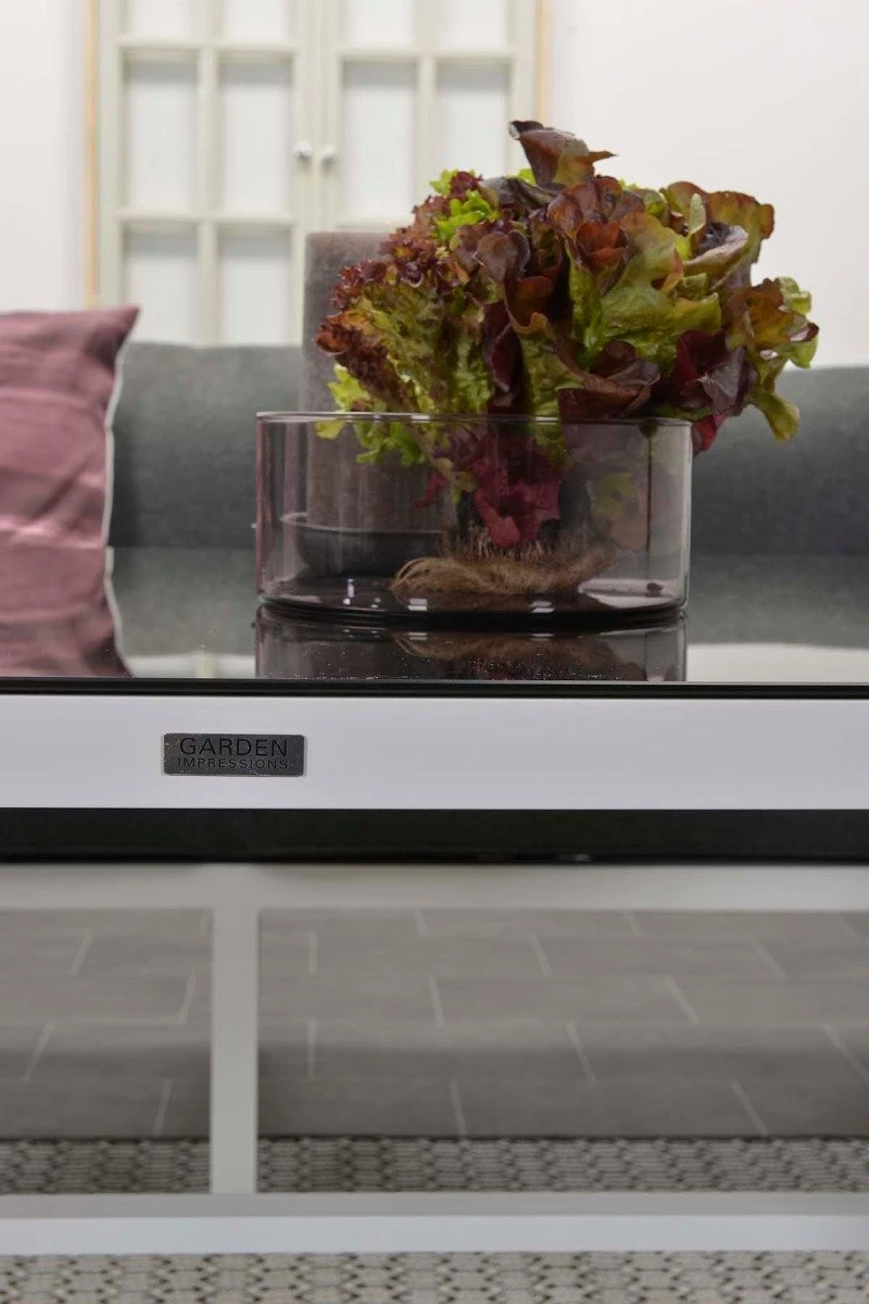 Cet ensemble de salon complet est fait d’aluminium sans entretien et résistant aux intempéries avec un revêtement en poudre blanc robuste. Les coussins fournis sont en polyester de haute qualité. Les coussins de couleur noire ont une fermeture éclair pour que les housses puissent être facilement lavées à la main. Les coussins ne sont pas imperméables et peuvent être rangés dans la remise ou le casier à coussins après utilisation. La table spacieuse est en aluminium avec une plaque de verre trempé.