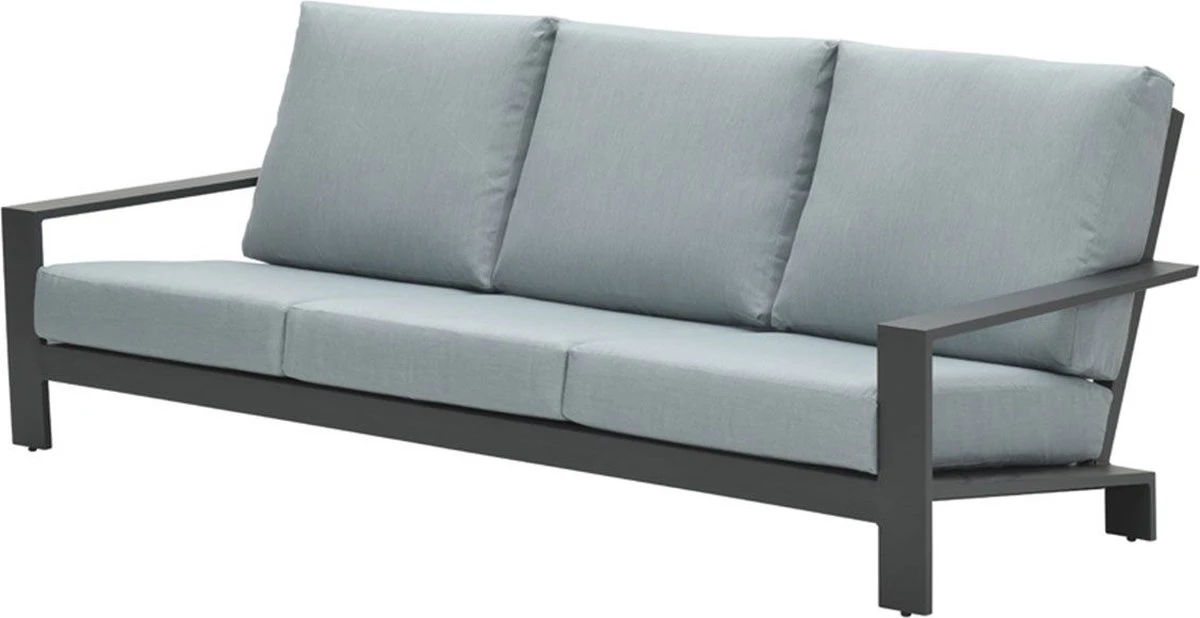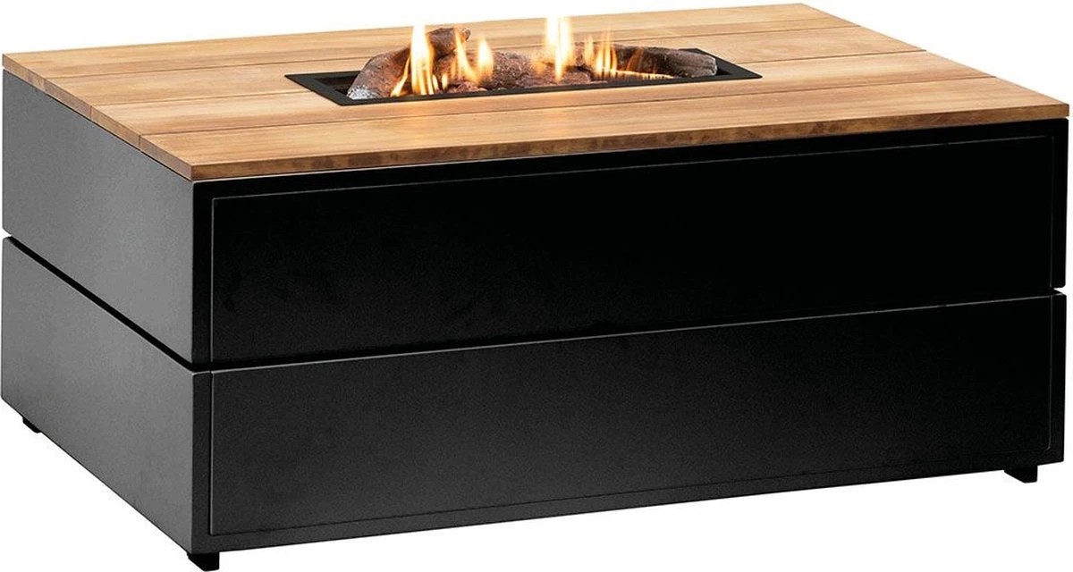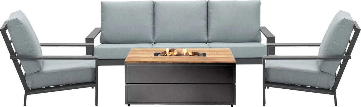 Cet ensemble de salon Coba est fabriqué en aluminium sans entretien et résistant aux intempéries avec un revêtement en poudre gris foncé robuste. Les coussins épais fournis sont en polyester de haute qualité et ont une fermeture éclair, de sorte que les housses peuvent facilement être lavées à la main. Les coussins ne sont pas imperméables et peuvent être rangés dans la remise ou le casier à coussins après utilisation. Cependant, les coussins sont pourvus d’un revêtement hydrofuge. C’est particulièrement pratique lorsque vous renversez, par exemple, une boisson est renversée sur le coussin. Vous pouvez facilement essuyer l’humidité. La table foyer Cosipure a un cadre en aluminium ouvert et élégant, disponible en plusieurs couleurs. Zwart pour un look industriel cool et blanc pour un look frais et moderne. Le bois de teck donne à la table à feu un aspect très agréable. Le foyer de table Cosipure 120 x 80 cm fonctionne sur une bouteille de gaz de 5 kg. Malgré la hauteur limitée de la table, la bouteille de gaz est subtilement dissimulée sous le plateau de la table. La table de feu est facile à allumer au moyen d’un allumage piézo électrique. Pour que vous puissiez rapidement profiter de la chaleur.Le dessus est en bois de teck durable. En principe, le bois de teck est également sans entretien, mais il vieillit avec le temps. Souhaitez-vous conserver la couleur d’origine ? Ensuite, nous recommandons de traiter le bois avec des produits d’entretien spéciaux pour le teak. Dimensions canapé lounge : 230 x 96,5 x 78 cm, fauteuil lounge : 90 x 95 x 78 cm et table à feu : 120 x 80 cm.