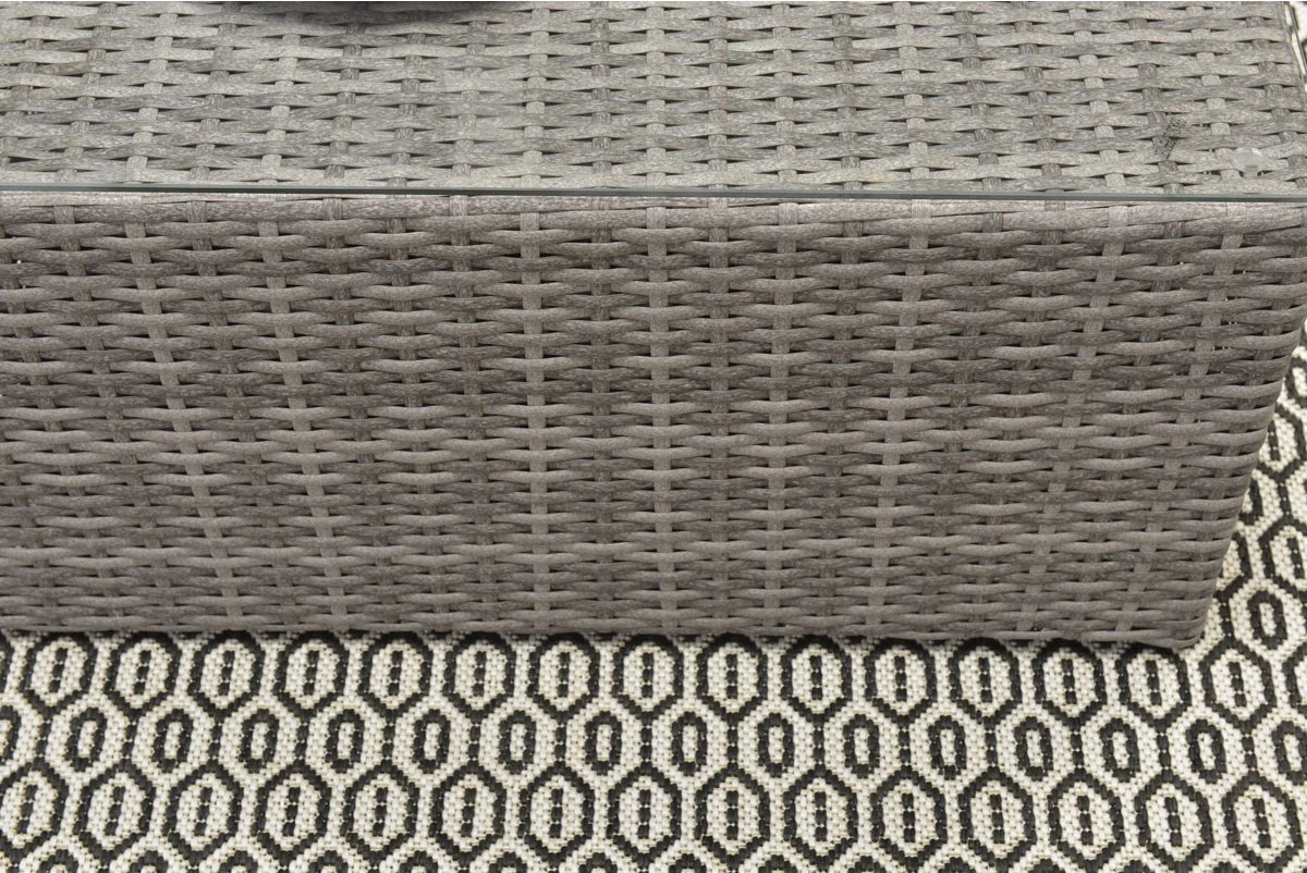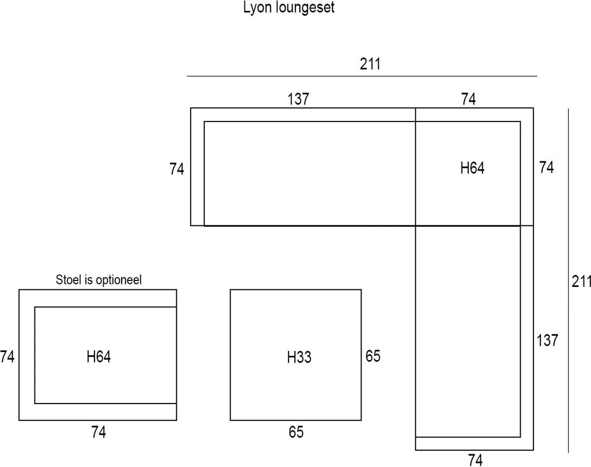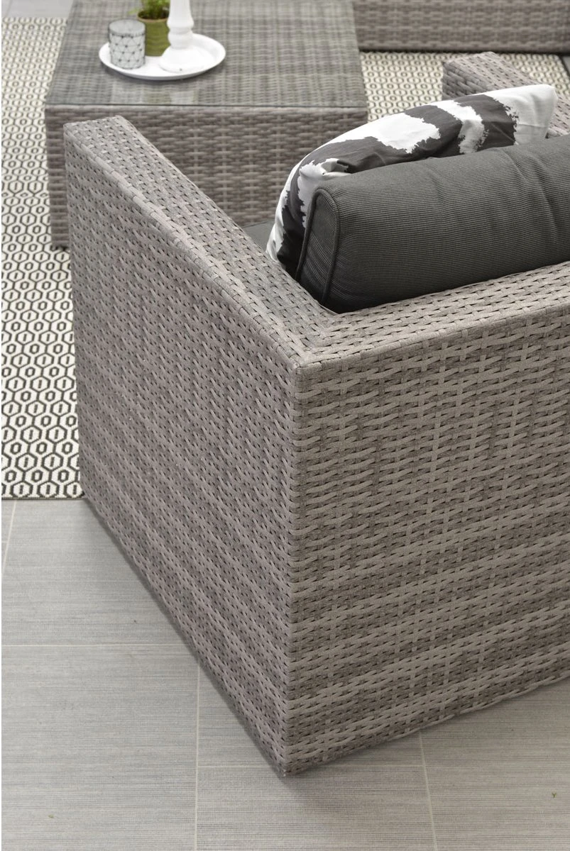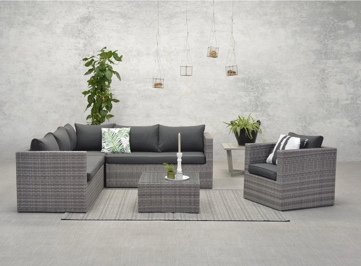 Bel ensemble de salon compact où vous pourrez vous détendre. Dans cet ensemble lounge, vous pourrez déguster un bon verre, mais aussi lire un livre allongé au soleil. C’est l’un des ensembles de salon les plus populaires de la collection depuis des années. Avec cet ensemble, vous profitez vraiment de chaque journée d’été. L’ensemble de salon Lyon s’intègre dans presque tous les jardins en raison de sa forme et de ses dimensions. L’ensemble de salon Lyon se compose de deux parties de canapé de salon spacieuses, d’un élément d’angle, d’un fauteuil de salon luxueux et d’une table avec plateau en verre trempé. Les parties séparées de cet ensemble peuvent être attachées les unes aux autres au moyen de clips en bas, de sorte que les éléments ne peuvent pas bouger. Cet ensemble résistant aux intempéries est composé d’un cadre en aluminium robuste entouré d’un fil de tressage en osier de haute qualité de couleur gris organique. Cet osier est fait de plastique robuste, ce qui rend l’ensemble très durable. Bien sûr, cet ensemble de salon est livré avec des coussins d’assise et de dossier. Les coussins ont une fermeture éclair pour que les housses puissent être facilement lavées à la main. Les coussins ne sont pas 100% imperméables, mais ont un revêtement hydrofuge. C’est particulièrement pratique lorsque vous renversez, par exemple, une boisson est renversée sur le coussin. Vous pouvez facilement essuyer l’humidité. Après utilisation, les coussins peuvent être rangés dans le hangar ou dans une taie d’oreiller. Les dimensions de cette configuration sont: L 211 x W 211 cm. La table mesure 65 cm de long, 65 cm de large et 33 cm de haut. Vous trouverez une vaste collection d’ensembles lounge dans la catégorie mobilier de jardin. Meubles de jardin de différentes belles marques.