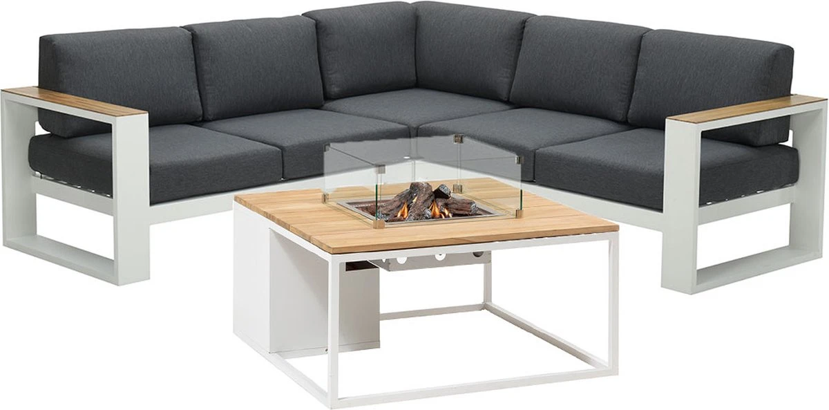 Avec cet ensemble de salon combiné avec une table à feu, vous pouvez rester bien au chaud pendant les soirées d’été. L’ensemble de salon Plaza avec la table à feu Cosiloft est un atout pour le jardin. L’ensemble de salon a des coussins confortables et un aspect robuste. Le cadre de l’ensemble de salon est en aluminium résistant aux intempéries avec un revêtement en poudre robuste. Les coussins fournis sont en polyester de haute qualité et ont une fermeture éclair. Les coussins ont un revêtement hydrofuge. C’est surtout très pratique si, par exemple, des boissons se renversent sur l’ kussen . Vous pouvez facilement essuyer l’humidité à nouveau. La table feu de salon CosiLoft 100 cm a un élégant cadre ouvert en aluminium de couleur blanche. Le plateau de ce foyer est en teck. Une plaque de recouvrement, 4 foyers en céramique, un tuyau de gaz et un régulateur de pression de gaz sont fournis en standard avec chaque foyer de salon Cosiloft. Avec la plaque de recouvrement, vous pouvez protéger le brûleur contre la saleté. Vous pouvez utiliser toute la surface de la table pour mettre en place de délicieuses collations et boissons, par exemple. L’ensemble de salon mesure 234 sur 234 cm et mesure 65 cm de haut. La table à feu a une taille de 100×100 cm et une hauteur de 47 cm. La table à feu fonctionne avec une bouteille de gaz Benegas de 5 kg non incluse et consomme au maximum 608 grammes par heure. La table foyer de salle à manger Cosiloft est livrée prête à l’emploi, comprenant un détendeur 30mBar avec tuyau de gaz, des bûches en céramique, des pierres de lave et une plaque de recouvrement. NB ! Le verre et la bouteille de gaz ne sont pas inclus.